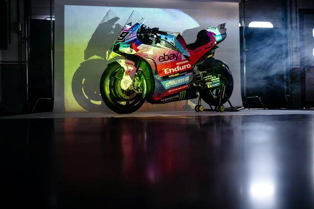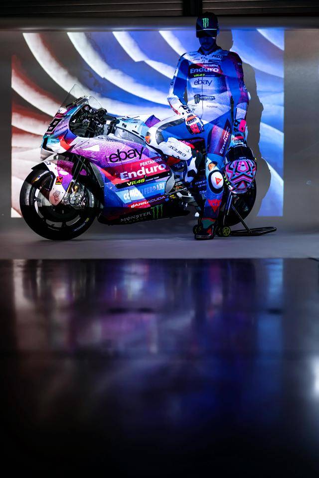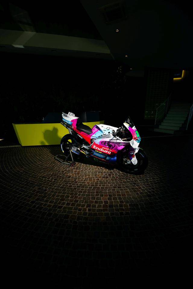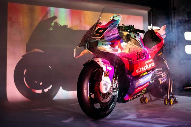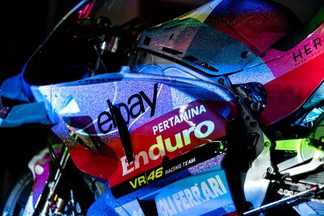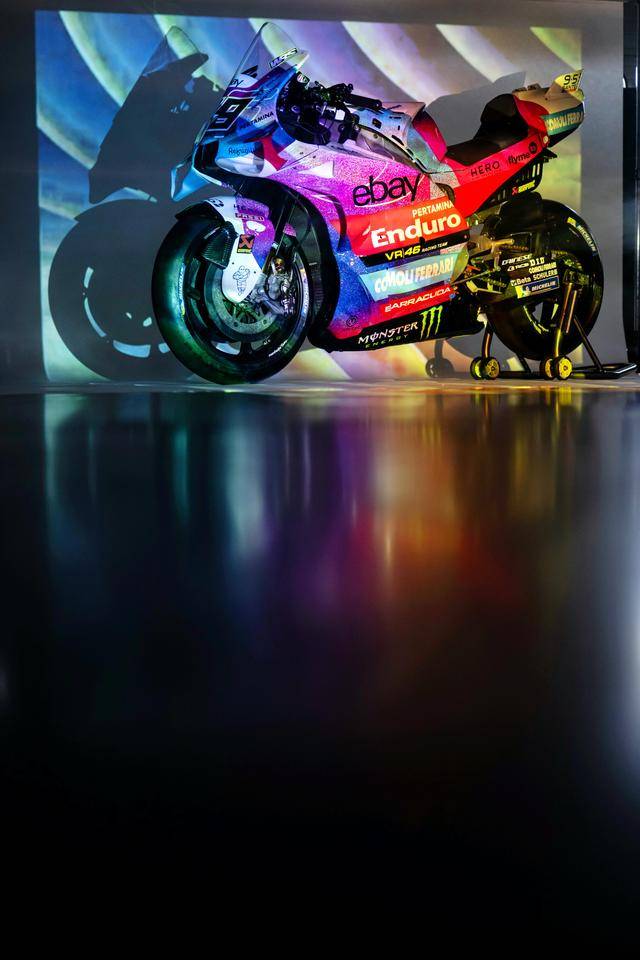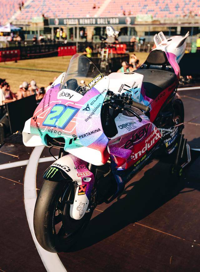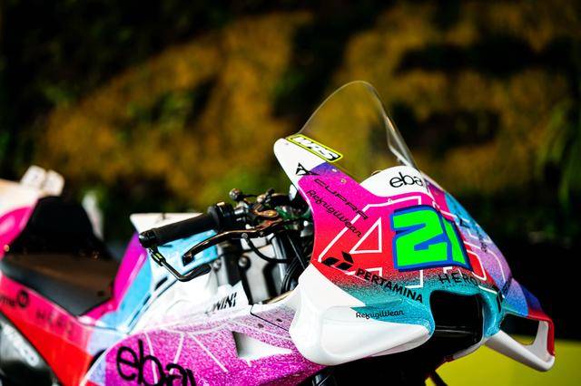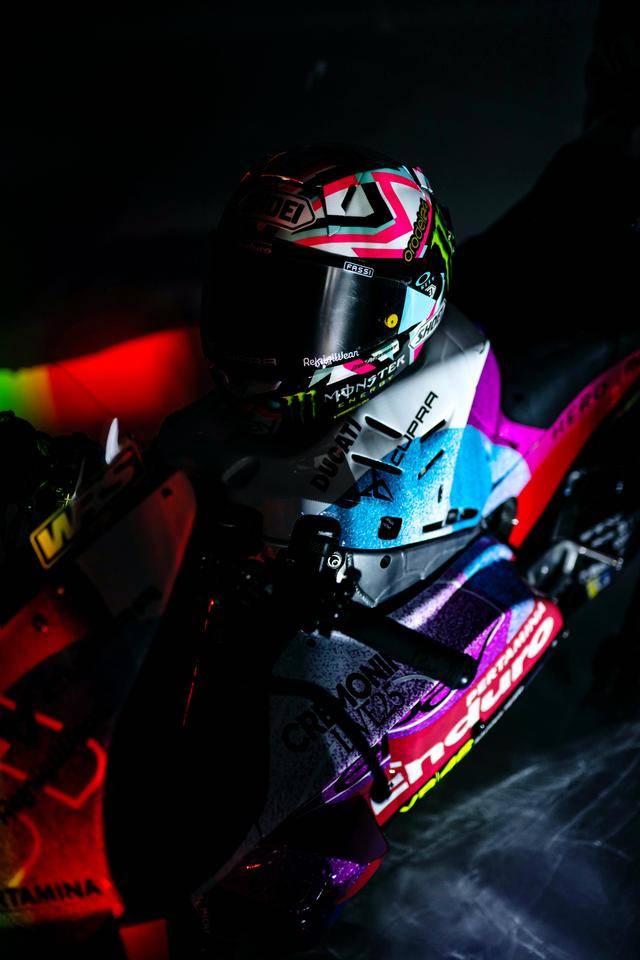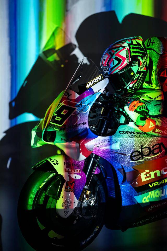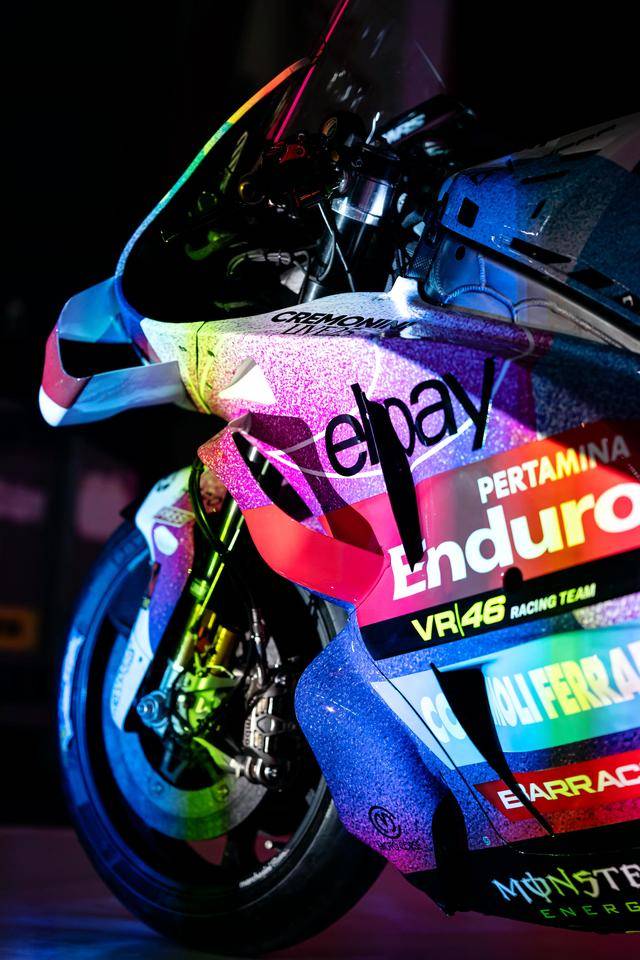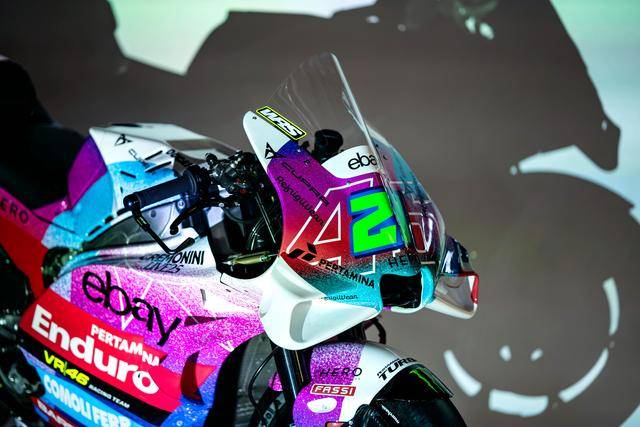 * VR46 車隊(duì)在這場(chǎng)意大利站比賽的特別圖案由德魯?shù)希―rudi Performance)設(shè)計(jì),該圖案用以對(duì)克雷莫尼尼最新的音樂專輯《Alaska Baby》的致敬。圖案以紫色和淡藍(lán)色為焦點(diǎn),構(gòu)成一個(gè)北極光的風(fēng)格,設(shè)計(jì)者稱,他們期待讓所有的色調(diào)結(jié)合在一起、創(chuàng)造出一種協(xié)同效應(yīng),從而喚起了車隊(duì)和歌唱者之間的聯(lián)系;