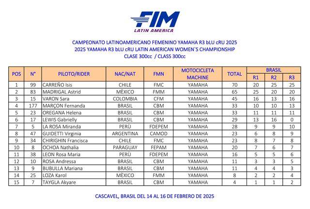 二月 14 - 16 日的時候,F(xiàn)IM 拉丁美洲聯(lián)合會與巴西 Yamaha 賽車(Yamaha Racing Brasil),聯(lián)合舉辦了 2025 FIM 拉丁美洲 Yamaha R3 BLU CRU 女子錦標(biāo)賽(2025 Campeonato Latinoamericano Femenino Yamaha R3 bLU cRU),這是拉丁美洲地區(qū)、首次舉辦專為女車手而設(shè)的公路型兩輪大賽。