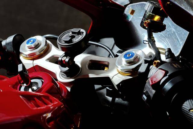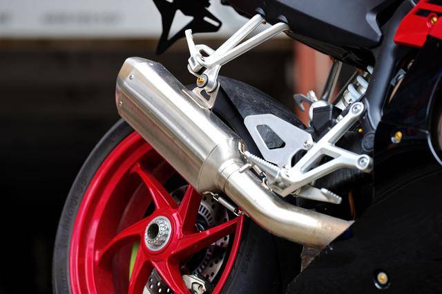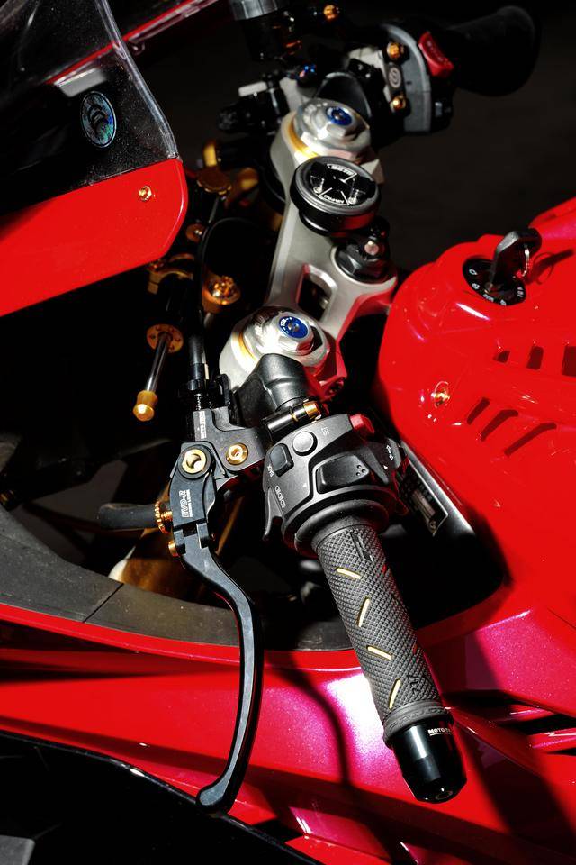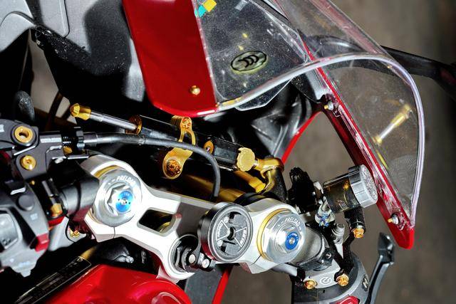 下圖的這輛經(jīng)過小幅度修改的 500RR 是后單搖臂版,一對徑向安裝的 Brembo 布雷博前剎車卡鉗、以及 RCS 上剎車泵,是這輛 “ 怡情小改 ” 之跑車的焦點;輔以輕量化的金色螺栓、Moto-Tron 的離合器拉桿(離合牛角)和護弓、防摔護桿等作為點綴 —— 再改下去,既難以在國內(nèi)當(dāng)前的公共道路上 “ 免檢 ”、其成本也將輕松超越購車的金額。