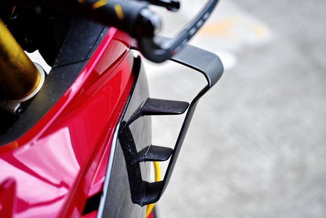 從自己的角度去看,如果改裝市場上、有更具流線型的定風(fēng)翼供選擇,那也是值得考慮的:無論是正面視角還是俯視角、幾乎都是呈平直狀態(tài)的原廠定風(fēng)翼,如此硬朗的風(fēng)格、與車頭的平滑線條相結(jié)合之下,總感覺缺了點什么 ... ... ... 甚至、這跟 MotoGP 賽車的定風(fēng)翼設(shè)計一樣的難看。