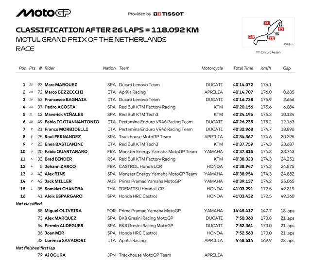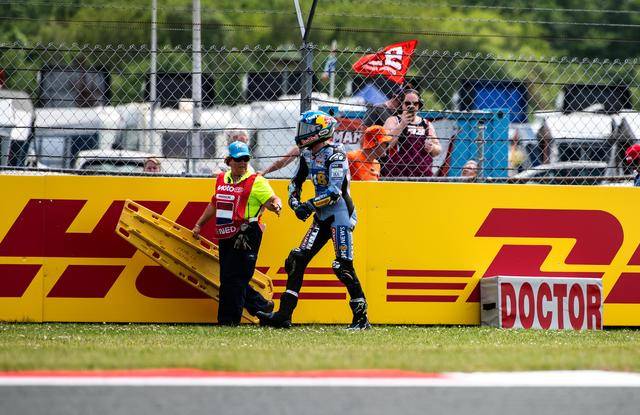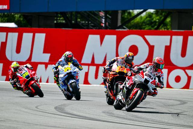 MotoGP 級別周日(六月 29 日)進(jìn)行的正賽、賽程為 26 圈。比賽的前 5 圈,前面五、六位車手的近身格斗,為觀眾們呈現(xiàn)了一場短暫而激烈的冠軍爭奪戰(zhàn),也是在這一圈,馬昆斯從隊(duì)友巴納亞手上、奪回了領(lǐng)先位置;第 6 圈,小馬昆斯與 37 號車的西班牙車手阿科斯塔(Pedro Acosta)發(fā)生擦碰、并導(dǎo)致發(fā)生意外而退賽,賽后,小馬昆斯確認(rèn)左手骨折。