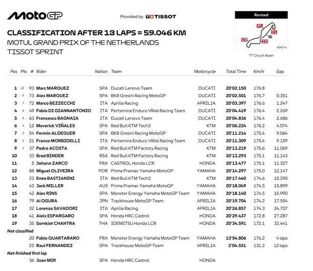 賽程為 13 圈的 Sprint短途沖刺賽,駕駛 93 號車的馬昆斯(Marc Marquez)很快就取得了領(lǐng)先的位置,僅僅是到第 2 圈、從第一位出發(fā)的夸塔拉羅就掉到了第四;大部分的比賽時間里,冠軍之爭仍與此前的沖刺賽一樣,焦點(diǎn)落到了馬昆斯兄弟倆的追逐上。最終,馬昆斯率先沖線、連續(xù)第三場拿到?jīng)_刺賽的冠軍,相差僅僅約 0.3 秒、小馬昆斯獲得了第二,兄弟倆再次包辦了冠、亞軍;駕駛 72 號車的意大利車手貝澤奇(Marco Bezzecchi)奪得了第三名。