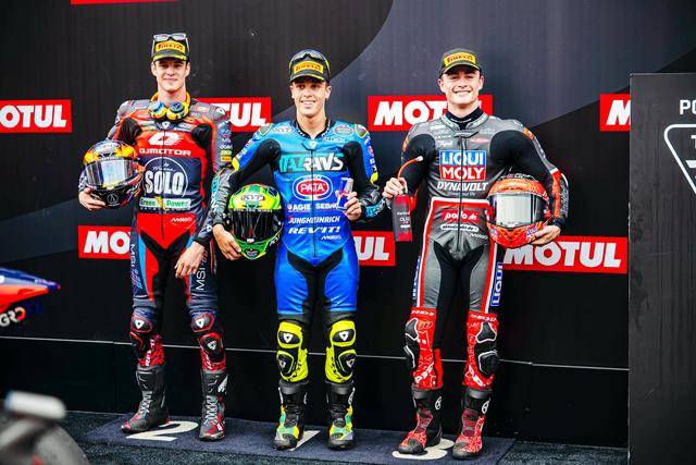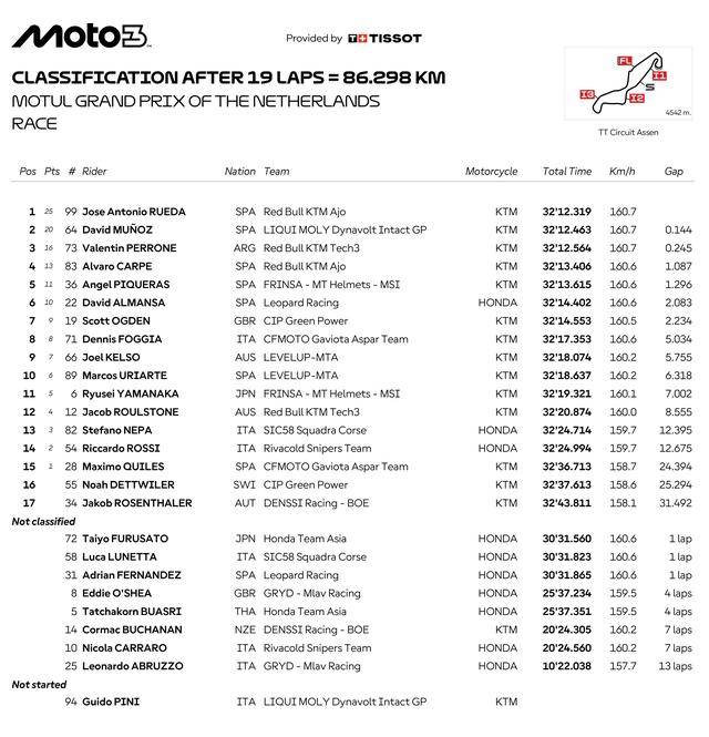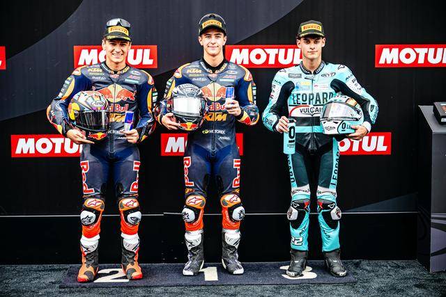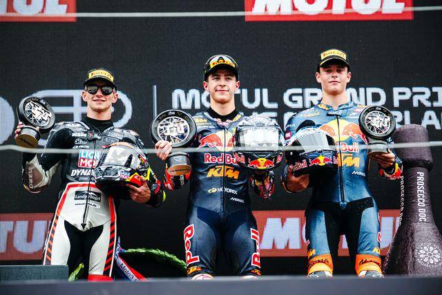 Moto3 級(jí)別,KTM 紅牛陣營(yíng)在本站比賽里表現(xiàn)亮眼,駕駛 99 號(hào)車的西班牙車手魯埃達(dá)(Jose Antonio Rueda)從排頭位出發(fā),在 19 圈的比賽里、始終保持著旺盛的斗志,并在最后時(shí)刻以微弱的優(yōu)勢(shì)、奪得了冠軍,拿到了本賽季的第六次勝利;另一位西班牙車手、駕駛 64 號(hào)車的穆諾茲(David Munoz)獲得了亞軍,落后前車僅僅 0.144 秒;今年開(kāi)啟自己世界錦標(biāo)賽職業(yè)生涯、駕駛 73 號(hào)車的阿根廷車手佩羅尼(Valentin Perrone)獲得了季軍,首次登上 Moto3 級(jí)別的頒獎(jiǎng)臺(tái)。