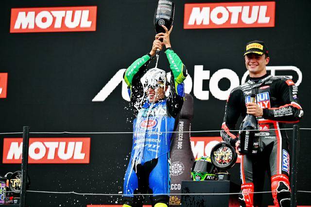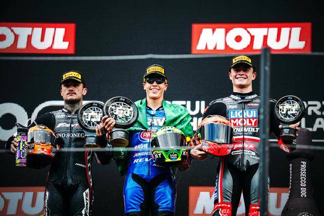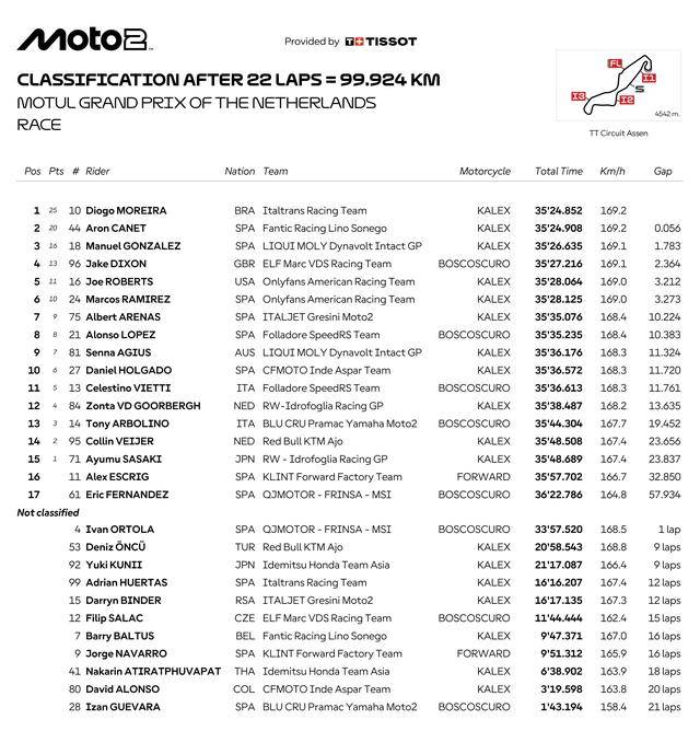 Moto2 級(jí)別,從排頭位起跑、駕駛 10 號(hào)車的巴西車手莫雷拉(Diogo Moreira),與第四位發(fā)車、駕駛 44 號(hào)車的西班牙車手卡內(nèi)特(Aron Canet),自比賽的第 2 圈開(kāi)始、就一直糾纏至最后沖線,兩人的激烈交鋒、最終以 0.056 秒之差分出了勝負(fù):莫雷拉奪得了冠軍,拿到了升級(jí)到 Moto2 級(jí)別之后的首場(chǎng)勝利;卡內(nèi)特獲得了亞軍,另一位西班牙車手、駕駛 18 號(hào)車的岡薩雷斯(Manuel Gonzalez)拿到了季軍。