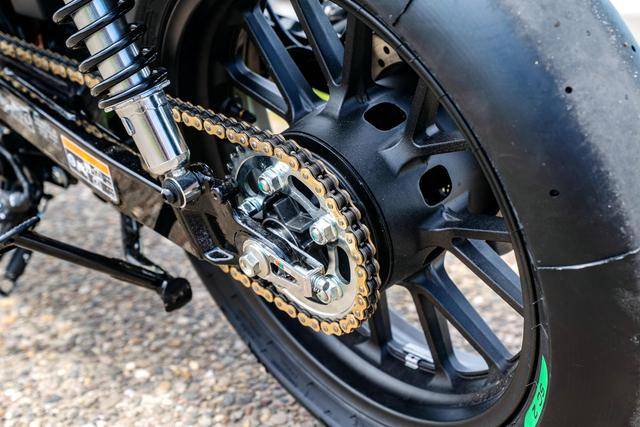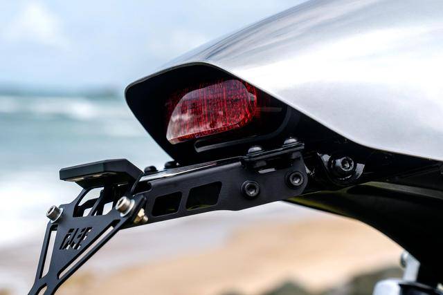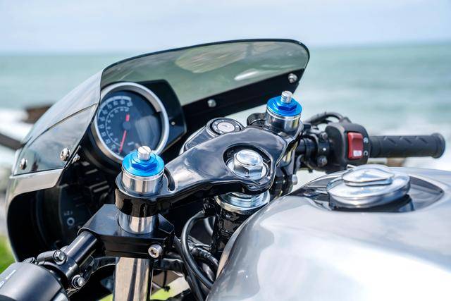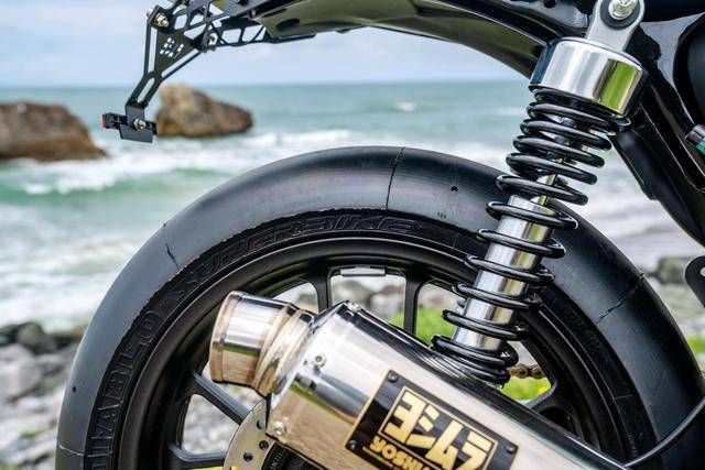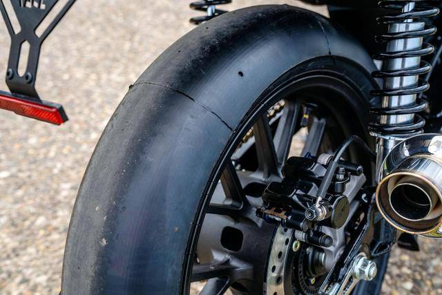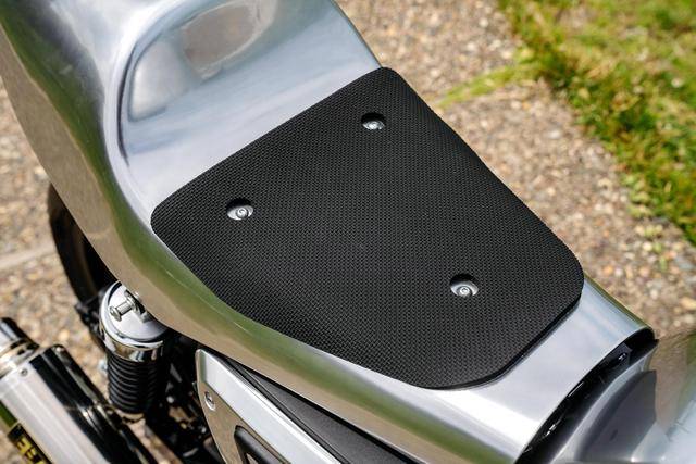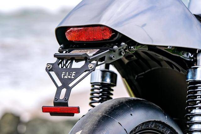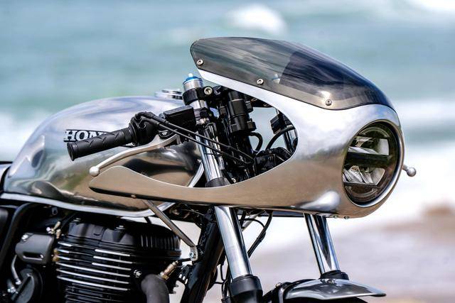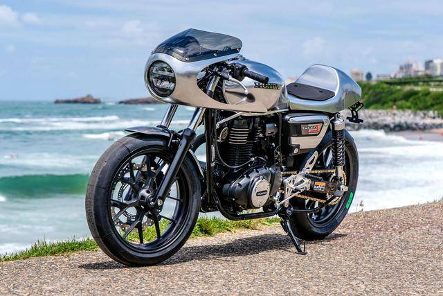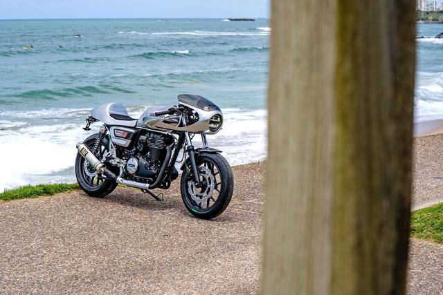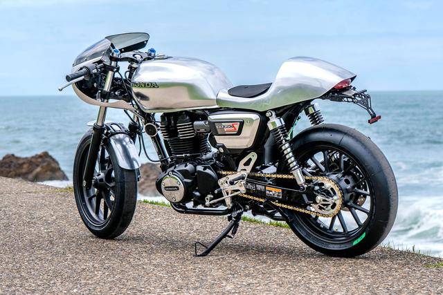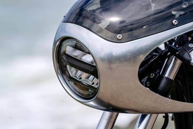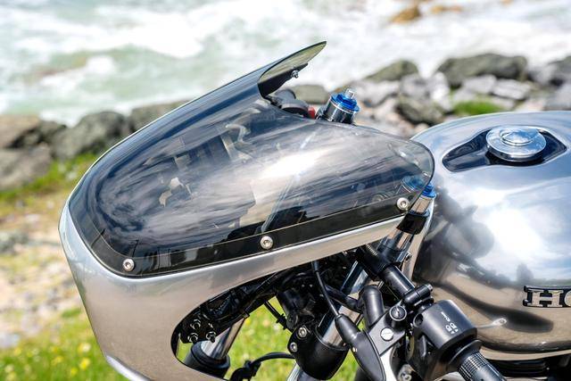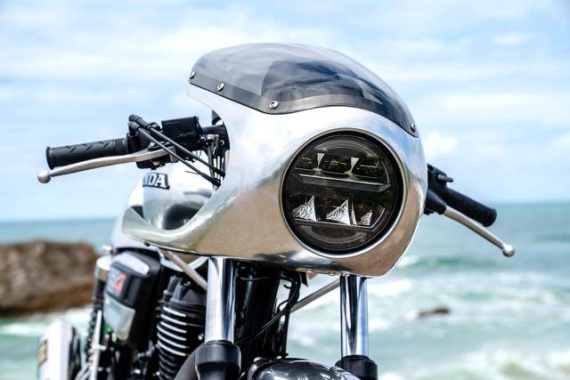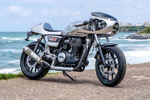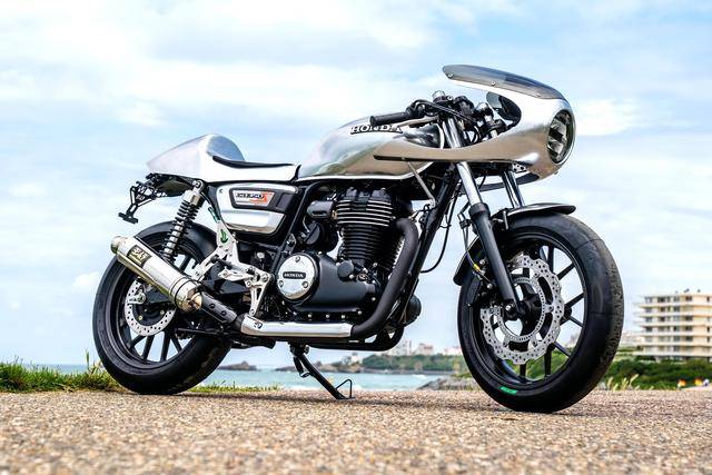 該作品基于 Honda 在去年向歐洲市場推出的復古車 GB350S 修改而成,裝上了被當?shù)胤Q之為 “ 錐鼻 ” 的、有著一個尖錐狀的車頭整流罩,換上了鋁制的油箱,賽車風格的分離式車把、提供了一個 “ 俯沖 ” 風格的騎行姿勢;換上了單座位的賽車外殼、配上了光頭的賽車輪胎,Yoshimura 吉村的排氣系統(tǒng)、CNC 加工而成的腳踏,再加上全銀色的車身主色調(diào),這是一個對 “ 咖啡賽車手 ” 經(jīng)典風格的絕佳演繹。
