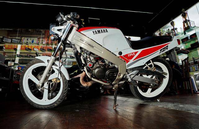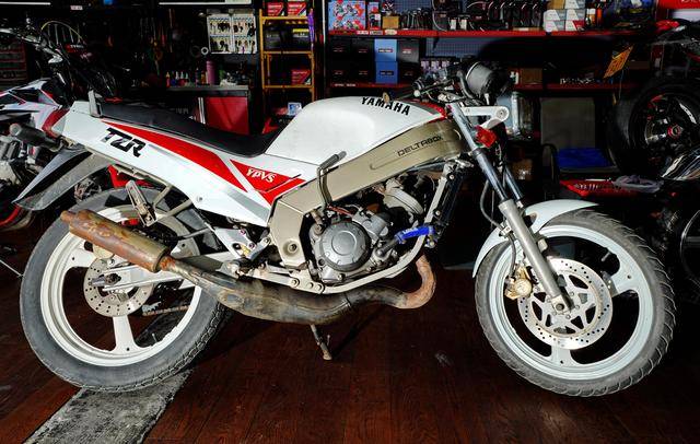 核心提示:日前,在速搏機(jī)車的店里,看到了這輛 1990 款的 Yamaha TZR125,采用了前后碟剎的配置、這意味著它是后期型的 3TY。在八十年代中