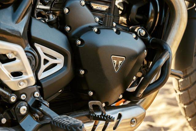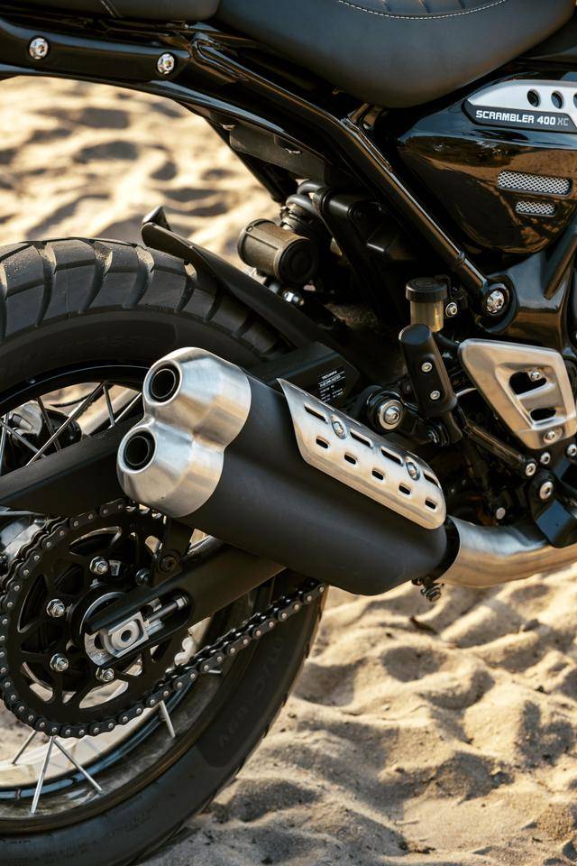 2025 Scrambler 400 XC 復(fù)古越野基于在 2023 年首次發(fā)布的 Scrambler 400 X 修改而成,與 Scrambler 400 X 和 Speed 400 共享了一副相同的水冷四沖程單氣缸、DOHC 四氣閥 發(fā)動機(jī),排氣量 398.15 cc,配備了電子燃油噴注系統(tǒng)、帶扭矩輔助的離合器(也就是所謂的滑動式離合器)、六檔的變速齒輪箱,最大動力輸出同為 29.4kw(約 40 匹)。