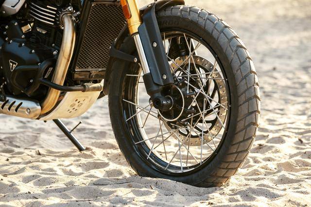 2、前 19、后 17 英寸的車輪,規(guī)格上保持不變,但換裝了專為全路況通過性而設(shè)計(jì) Excel 鋼線式的鋁制輪框(X 版采用了合金鑄造的前后車輪)和無內(nèi)胎結(jié)構(gòu)的 Metzeler 象牌 Karoo Street 輪胎;