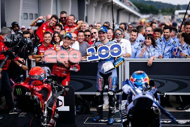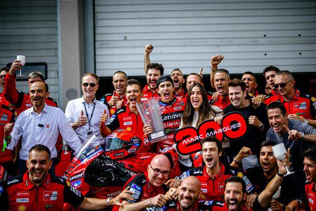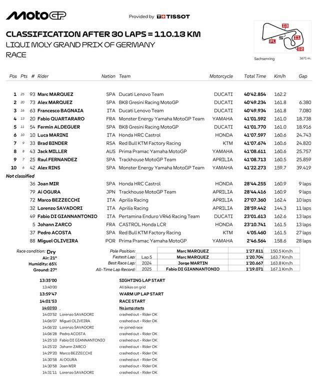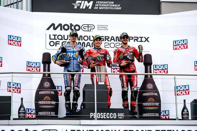 駕駛 73 號(hào)車的小馬昆斯(Alex Marquez)獲得了亞軍,帶傷上陣的他、落后哥哥 6 秒多,以登上頒獎(jiǎng)臺(tái)去慶祝他的第 100 場(chǎng)最高級(jí)別的比賽;后面,63 號(hào)車的意大利車手巴納亞(Francesco Bagnaia)拿到了季軍。而多達(dá)八位車手先后退賽、讓場(chǎng)上最后只剩下十位車手在飛馳,稱得上是 2025 德國(guó)站 MotoGP 級(jí)別正賽的另一個(gè)焦點(diǎn)。