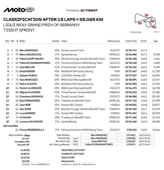 MotoGP 級(jí)別正賽的賽程為 30 圈。憑借著良好的開(kāi)局,起步就取得領(lǐng)先的馬昆斯、成功捍衛(wèi)了他 “ 薩森靈之王 ” 的稱號(hào),沒(méi)有受到多大的壓力、順利奪得了冠軍,在他的第 200 場(chǎng)最高級(jí)別的比賽中、取得的這場(chǎng)勝利,也是馬昆斯在德國(guó)薩森靈的第九個(gè)冠軍。