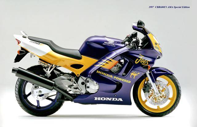 3、第二代中期改進(jìn)型:1995 - 1998 CBR600F,俗稱的 F3,工廠編號為 PC25(后期型),機(jī)械規(guī)格上、與 F2 大體相同,但換裝了更大口徑(36 mm 的化油器),并采用了全新設(shè)計(jì)的車身造型,懸掛、制動系統(tǒng)也經(jīng)過了升級;