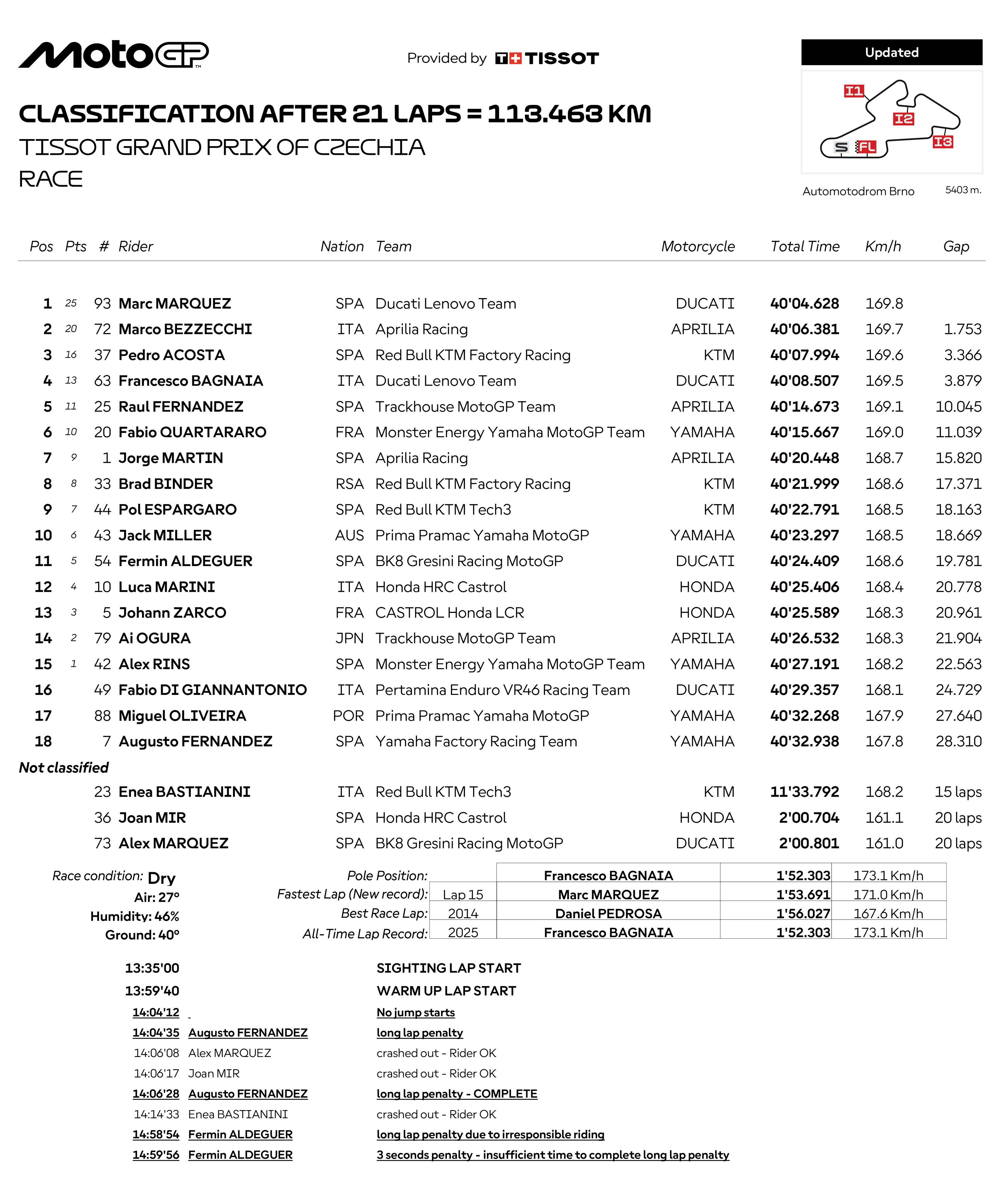 隨后的比賽里,馬昆斯穩(wěn)固了自己的優(yōu)勢(shì),沒(méi)有受到多大的威脅、順利奪得了捷克站正賽的冠軍,連續(xù)第五站拿到全勝。后面,貝澤奇拿到了亞軍,阿科斯塔獲得了季軍。