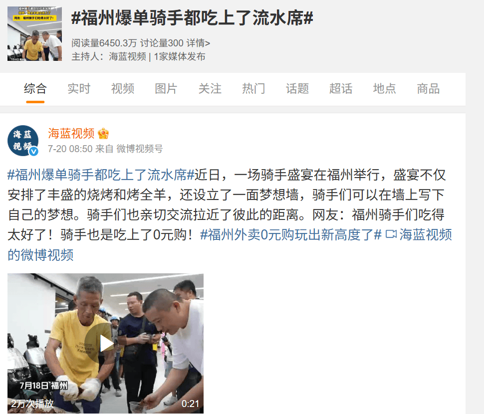 一則“福州爆單騎手都吃上了流水席”的話題以近6500萬(wàn)的流量迅速?zèng)_上了福州同城熱搜的最前列。