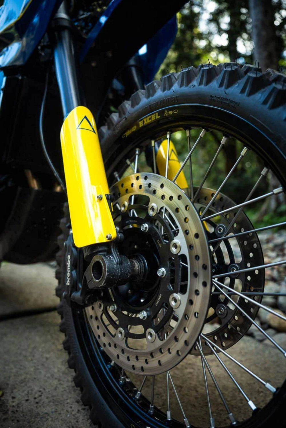 首先在涂裝上,他們換上了相當(dāng)亮眼的藍(lán)黃配色,最值得關(guān)注的是他的車架,全車采用了手工的鋁合金材質(zhì),完全沒有任何塑料材質(zhì)。 為了讓他真的可以到崎嶇的道路進(jìn)行探險(xiǎn),全車的懸掛都進(jìn)行了升級(jí),前懸掛換成了KTM 1190 Adventure R的48mm前叉、制動(dòng)也換上了Brembo的卡鉗,引擎下方也裝上了一個(gè)下護(hù)板避免引擎受到傷害。