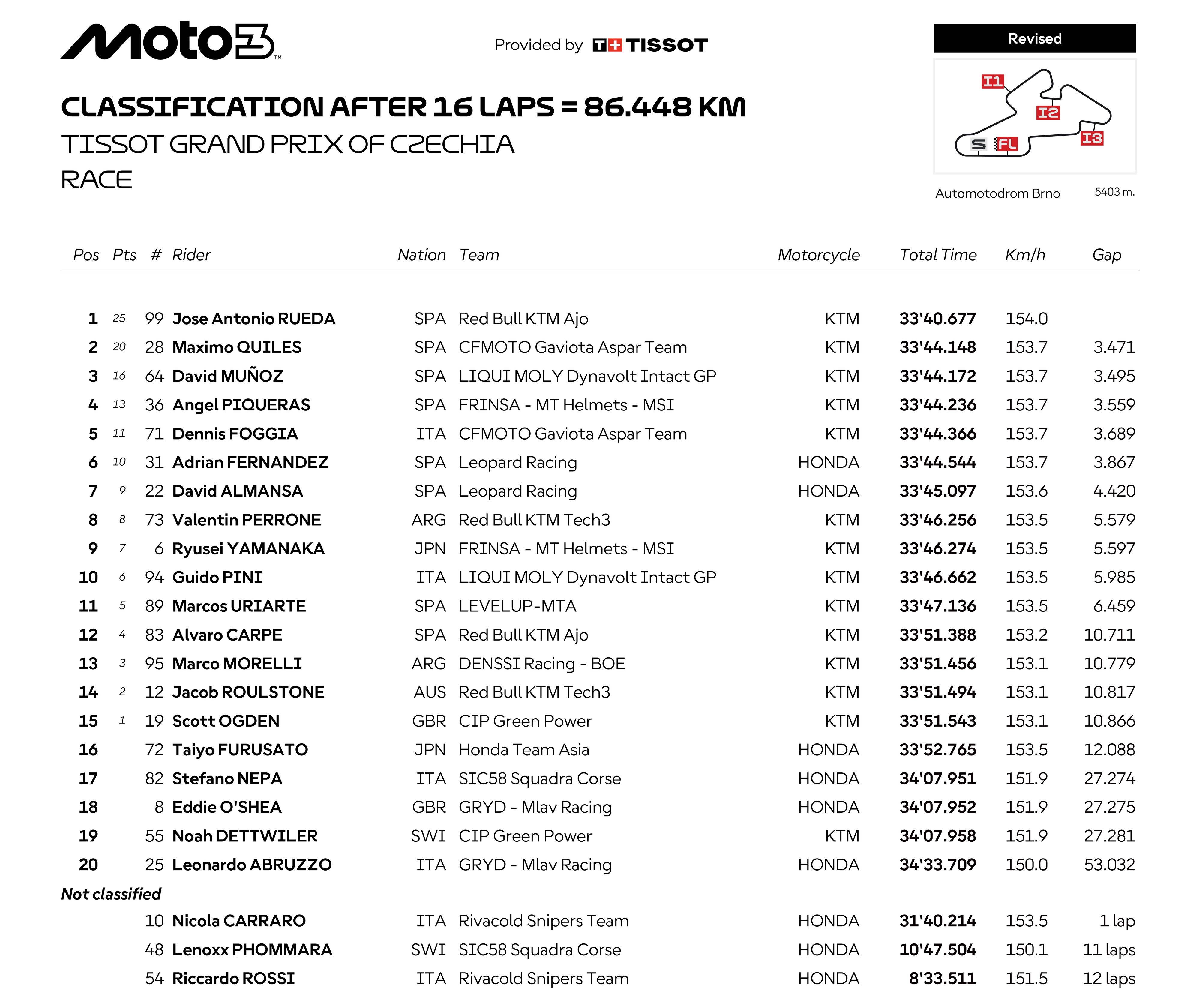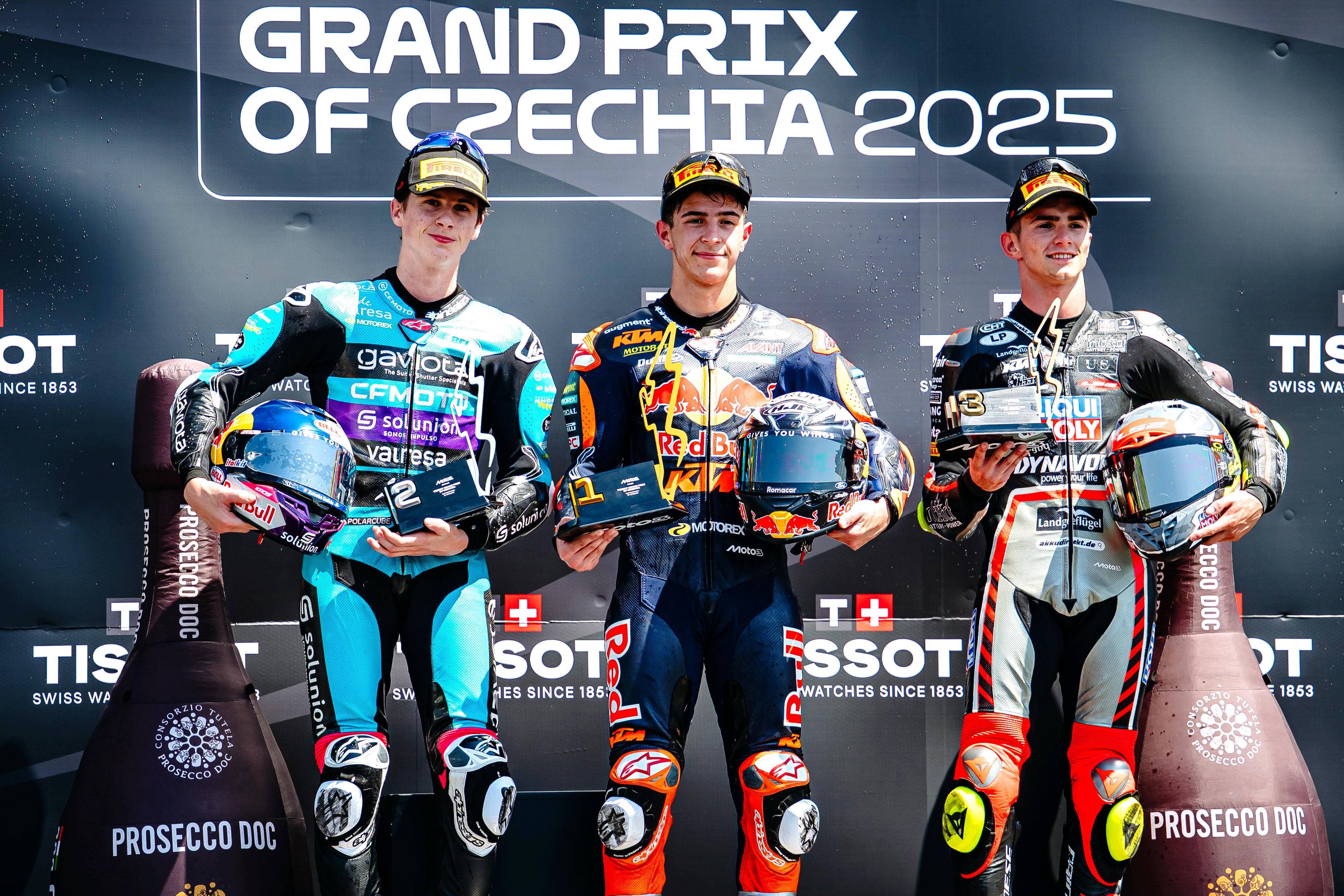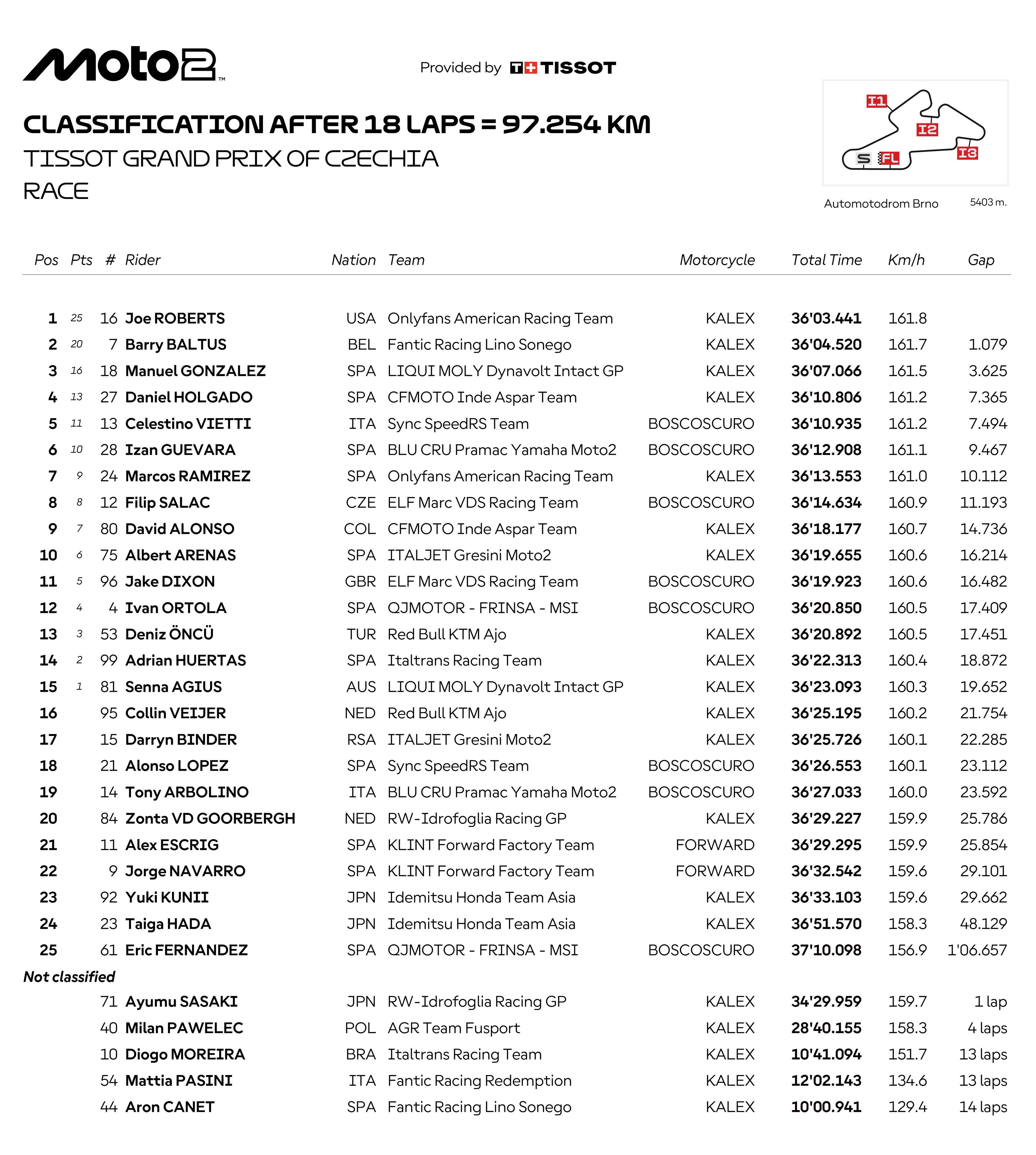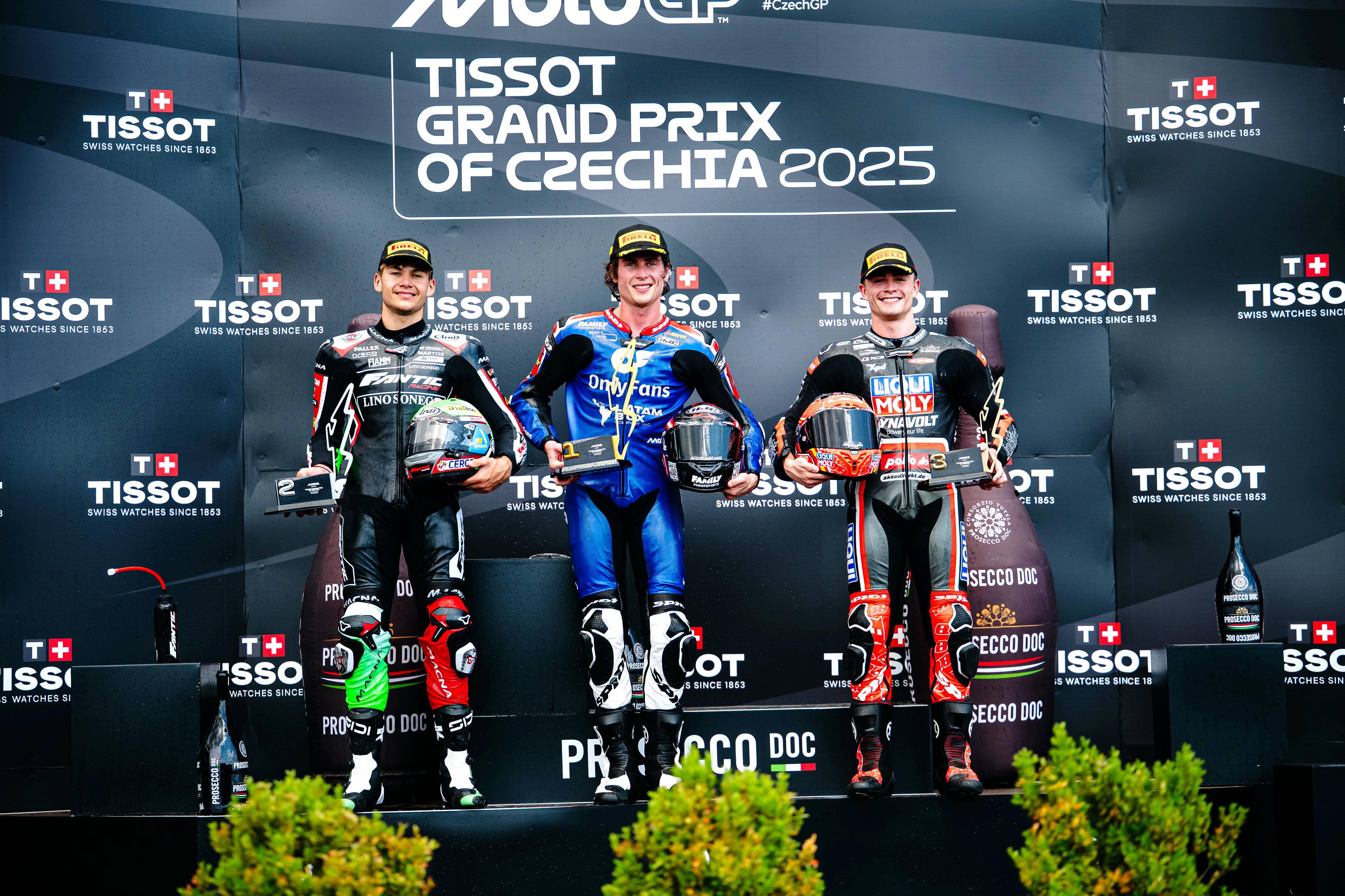 第 7 圈,羅拔士超越了此前幾圈都跑在前面的巴圖斯、拿到了領(lǐng)先位置;隨后的比賽里,羅拔士都一直帶頭、并成功抵御了巴圖斯不斷的試探與攻擊,最終奪得了捷克站 Moto2 級(jí)別的冠軍,拿到了他在 2025 賽季的首場(chǎng)勝利;從排頭位發(fā)車的巴圖斯、落后前車大約 1 秒拿到了亞軍,連續(xù)第二站比賽獲得第二;既追不上前車、又沒有其他車手威脅的岡薩雷斯拿到了季軍。