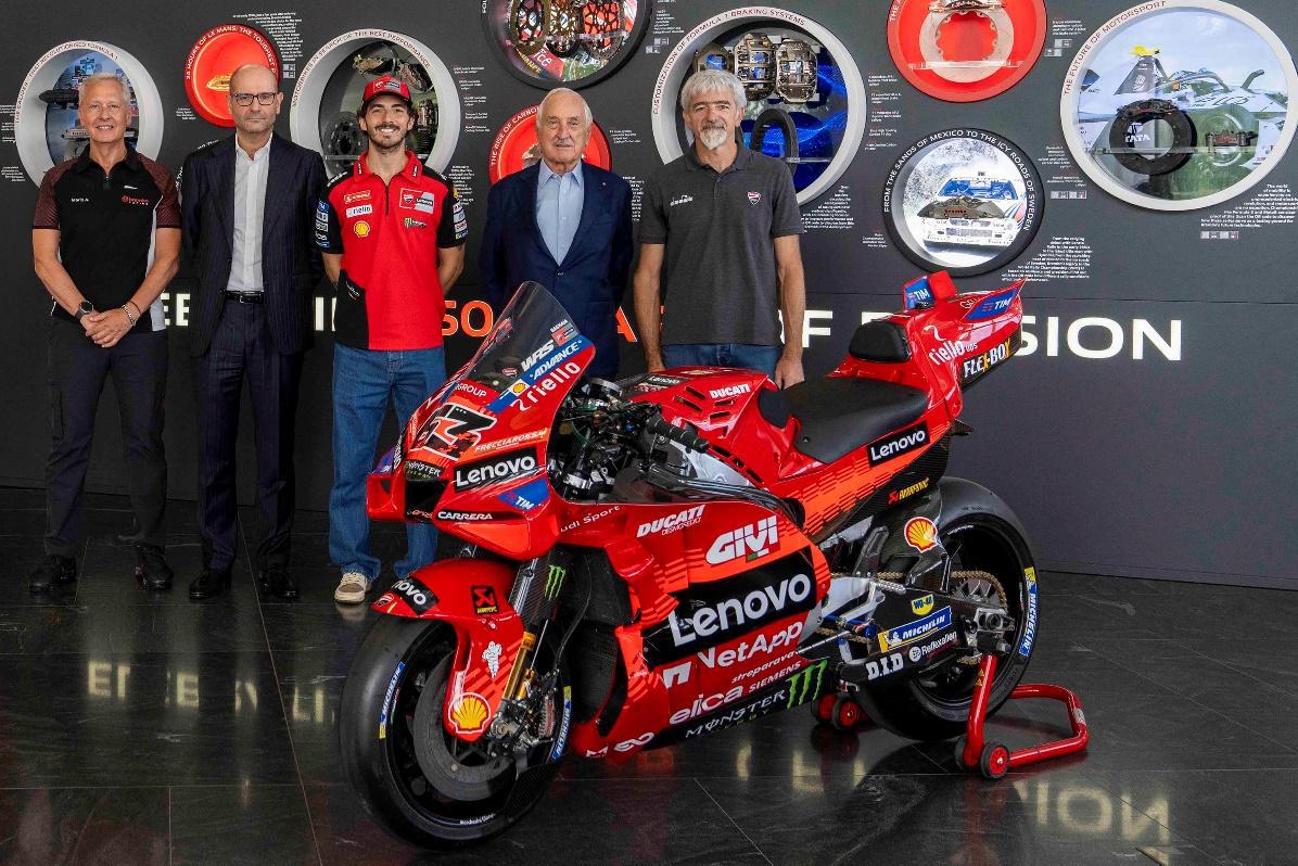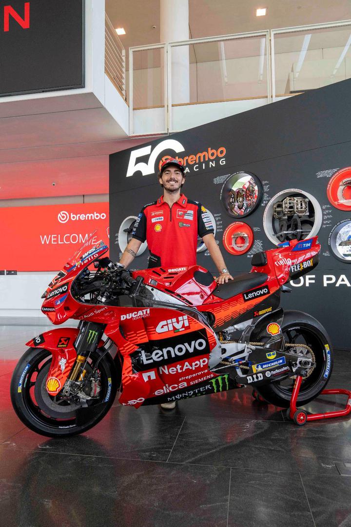(Pecco Bagnaia在布雷博總部與Ducati Desmosedici GP賽車合影)