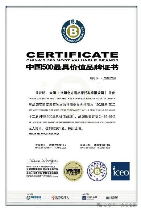 “大陽(yáng)”品牌——為中國(guó)摩托車十強(qiáng)品牌,品牌價(jià)值465.65億元(2025年《中國(guó)500最具價(jià)值品牌》第261位),是摩托車行業(yè)僅有的兩家中國(guó)500最具價(jià)值品牌之一,先后獲得中國(guó)馳名商標(biāo)、全國(guó)重點(diǎn)保護(hù)商標(biāo)等稱號(hào)。