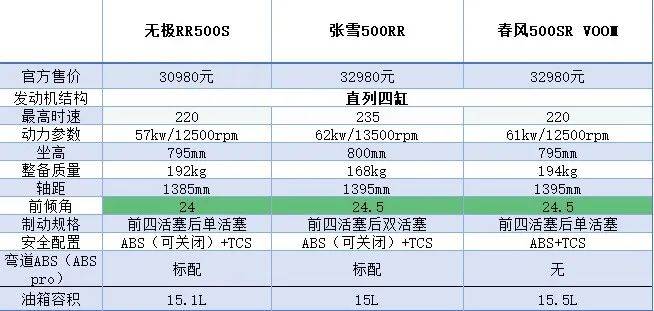 7月30日無極發(fā)布了自家的的第二臺4缸仿賽-RR500S,并將售價卷到了28980元起,高配版30980元更是加入了彎道ABS,轉(zhuǎn)向阻尼器,胎壓監(jiān)測等進階配置,有顏有料是對其最大的評價,那么除了價格與配置外,RR500S騎行感受如何呢,與同級的500級對手相比,表現(xiàn)如何,咱們今天且看靜態(tài)測評,后續(xù)動態(tài)即將奉上。摩托財智,贊5市場定位目前主流的500級仿賽車型,主要集中在幾個頭部品牌之間,按照銷量來看目前較為火熱的代表車型,主打極致熱愛,賽道性能出眾的張雪500rr,致敬經(jīng)典主打別樣風(fēng)格的春風(fēng)500SR,作為后來者的RR500S,競爭力表現(xiàn)如何,咱們一圖看清楚。張雪500RR作為之前凱越450RR系列的延伸作品,三車中最輕和最大的馬力帶來良好的動力性能,單搖臂的設(shè)計,極致就是張雪500RR性格所在,同屬32980元價位的500SR明顯更帶有年代感,不過這種復(fù)古跑車造型還是過于小眾,市場接受度不高。作為最后登場的RR500S,凝聚了無極的諸多匠心,供應(yīng)商全部采用國際一線配套,例如FCC摩擦片,BOSCH電噴,DID正時鏈條,NTN軸承等,三款車的配置水平基本相當(dāng),但RR500S要比同級低2000元,這個差價不容忽視,RR500S擁有足夠誠意和性價比。為了更貼合使用場景,RR500S增強了低扭表現(xiàn),發(fā)動機在5000rpm時即可釋放80%的最大扭矩,在日常與制霸山路之間做了良好的兼顧,在使用場景上更多元,是最接近日常所使用的一款。作為無極的第二臺四缸仿賽,RR500S與之前自家仿賽風(fēng)格不同,怒眉式燈帶配合透鏡大燈,營造出兇悍的戰(zhàn)斗氣息,仿佛一直獵鷹緊緊逼視前方,風(fēng)擋下方是碩大的沖壓進氣口,具體效果期待后續(xù)實測,兩側(cè)定風(fēng)翼與側(cè)板融合的相得益彰,除此之外定風(fēng)翼的連接非常結(jié)實,和老大哥RR660一樣,甚至可以當(dāng)防摔來用,側(cè)面也可以看出無極的巧思,配合非常翹的尾部造型,RR500S作為一臺跑車來看,是極具跑格且耐看的。燈光部分全部采用LED燈源,值得一提的是前部大燈采用裸露式透鏡燈珠,視覺效果犀利,后尾燈采用分裂式設(shè)計具有相當(dāng)高的辨識度,點亮后對后方車輛警示效果出色,好的設(shè)計思路值得傳承,這點與RR660保持高度一致。手把按鍵與儀表一起,已經(jīng)形成了無極的獨有配方,按壓質(zhì)感,阻尼感受皆屬上乘水準(zhǔn),各項菜單切換方便快捷,同時左手把設(shè)置了的單獨的TC關(guān)閉按鈕,長按即可關(guān)閉,開啟撒歡模式。動力來自無極最新直列四缸水冷引擎,實際排量為475cc,最大功率 57kW/12500rpm,最大扭矩 47Nm/11000rpm,最大轉(zhuǎn)速更是來到了14000rpm,相當(dāng)標(biāo)準(zhǔn)的四缸高轉(zhuǎn)引擎,讓這臺車的可玩性直線增加。同時,快速升擋+滑動離合完美配合,起步絲滑順暢,目前國內(nèi)一流快排水平,與此同時無極為了照顧到日常使用,對低扭表現(xiàn)做了加強,5000rpm時即可釋放80%的扭矩輸出。作為完美的50:50重心布局,配合整車1385mm的極短軸距,相較于同級別的進口車型的軸距,也處于領(lǐng)先段位,帶來非常靈活的操控,仿賽的魅力顯露無遺。