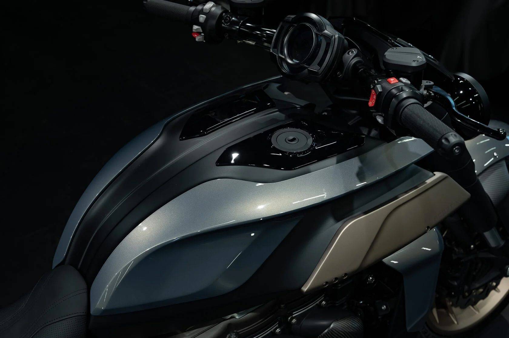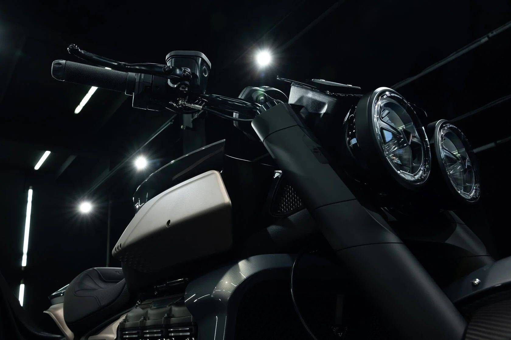 動(dòng)力部分依舊保留原廠那顆 2,458c.c. 直列三缸引擎,180 匹馬力、275Nm 的暴力輸出照舊上身,不動(dòng)引擎就已經(jīng)夠狠。 底盤改造才是重頭戲——自行設(shè)計(jì)加長(zhǎng)的懸臂式搖臂結(jié)構(gòu)讓后輪加寬到驚人的280mm,前后輪圈同步升級(jí)為18寸,比例瞬間更霸氣。 三角臺(tái)與前叉護(hù)蓋也重新設(shè)計(jì)到宛如精品,細(xì)節(jié)更襯托Rocket 3經(jīng)典的雙圓頭燈。