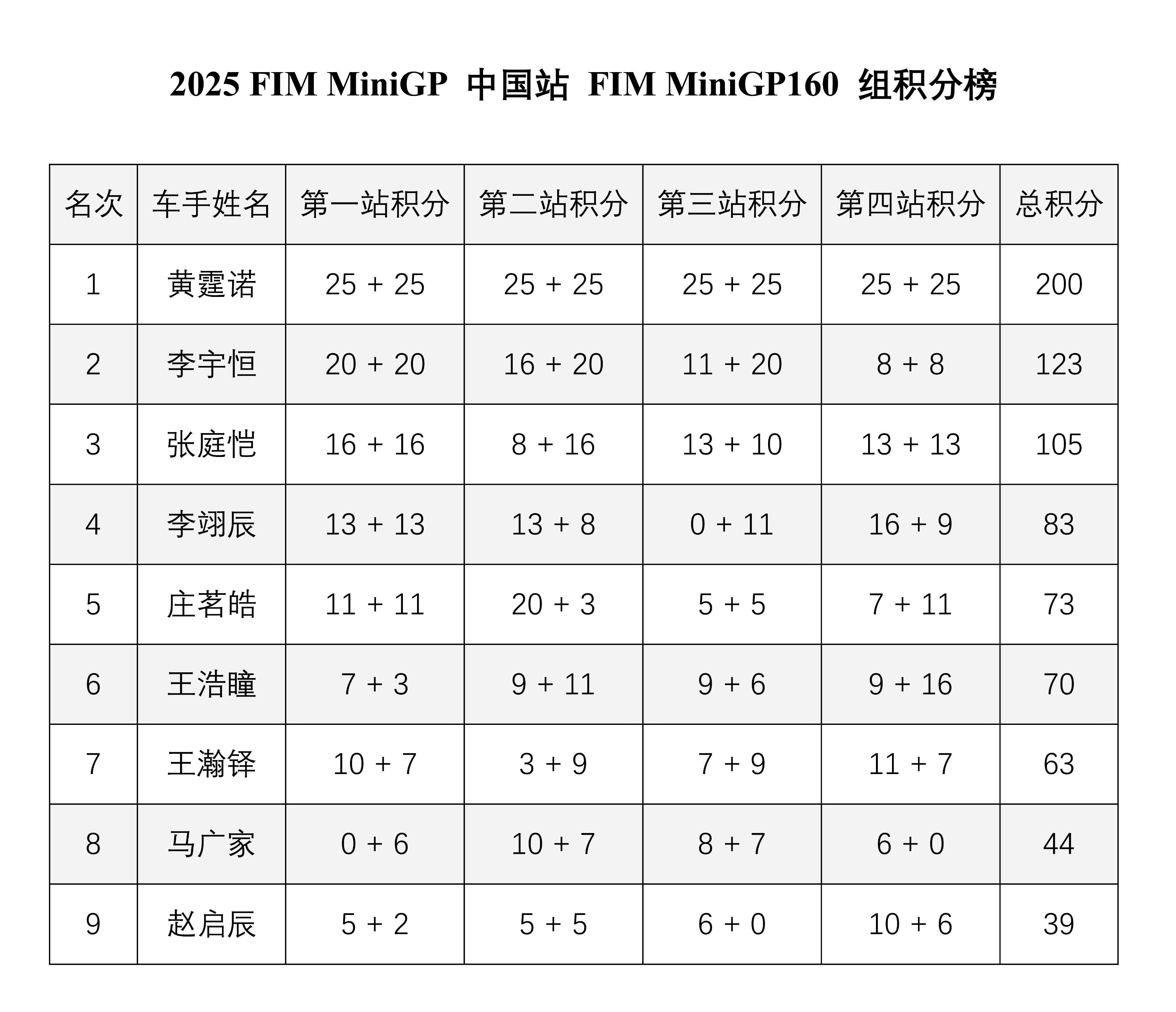 在第四站的比賽結(jié)束后,車手積分榜上,黃霆諾的積分達(dá)到了最高的 200 分、高踞榜首;而暫時(shí)排在積分榜第二名的李宇恒、當(dāng)前的積分是 123 分,排在第三位的張庭愷有 105 分。黃霆諾已經(jīng)獲得了足夠的積分,提前一站奪得了 2025 年中國(guó)站 160 組的總冠軍,率先拿到了進(jìn)軍西班牙全球年度總決賽的 “ 入場(chǎng)券 ” —— 這是他繼去年后,再次獲得這個(gè)資格。