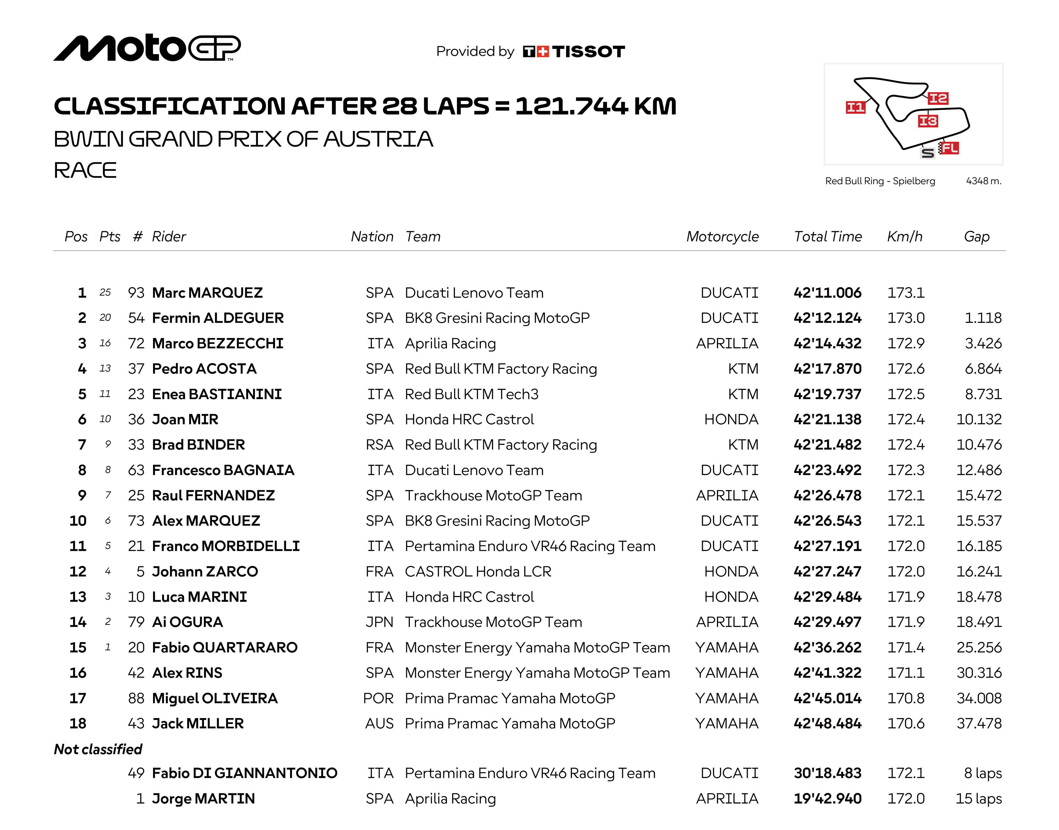 賽程為 28 圈的 MotoGP 級別正賽,從排頭位起步的貝澤奇、領(lǐng)跑了大半場的比賽;直到第 20 圈,跑在第二位、一直緊咬前車不放的馬昆斯找到了機(jī)會,成功超越的貝澤奇、拿到了領(lǐng)先位置;最后的幾圈比賽,馬昆斯始終保持著快速的節(jié)奏、并不斷拉大與后車的距離。最終,馬昆斯順利奪得了奧地利站的冠軍,連續(xù)第六站、獲得了全勝(沖刺賽和正賽的冠軍)。