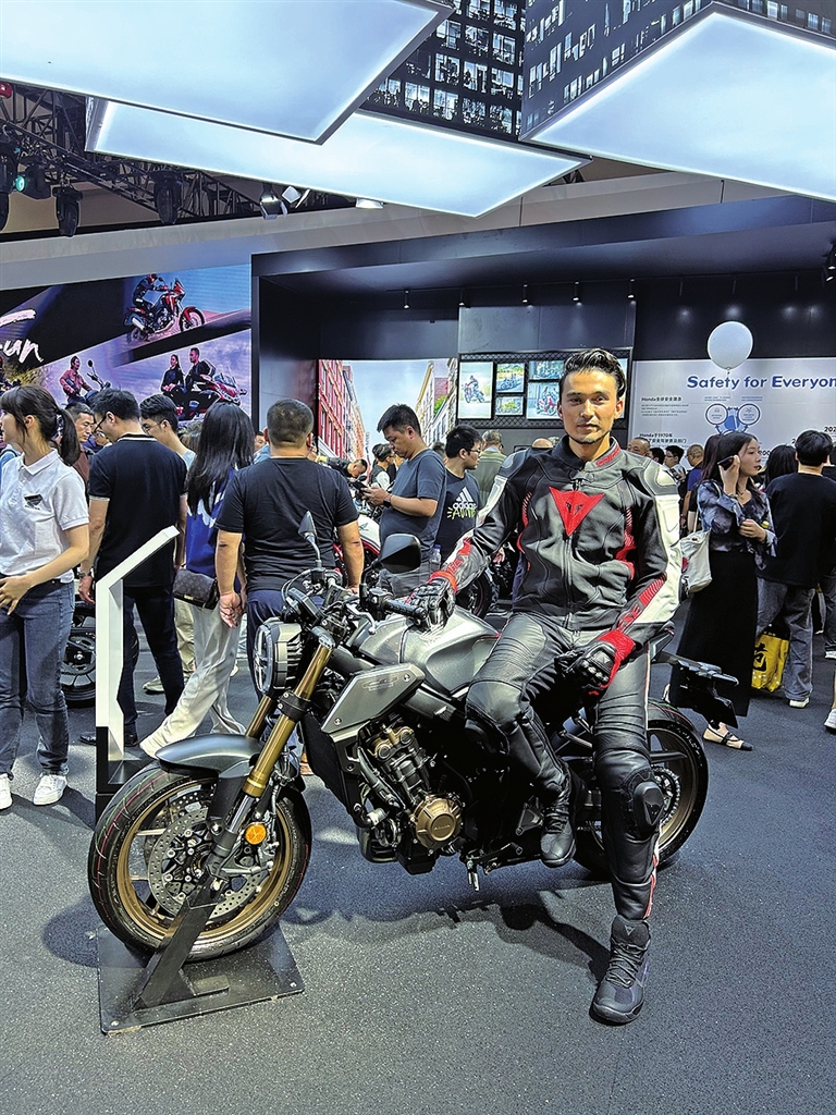 正在“摩博會”上體驗新款摩托車的消費(fèi)者