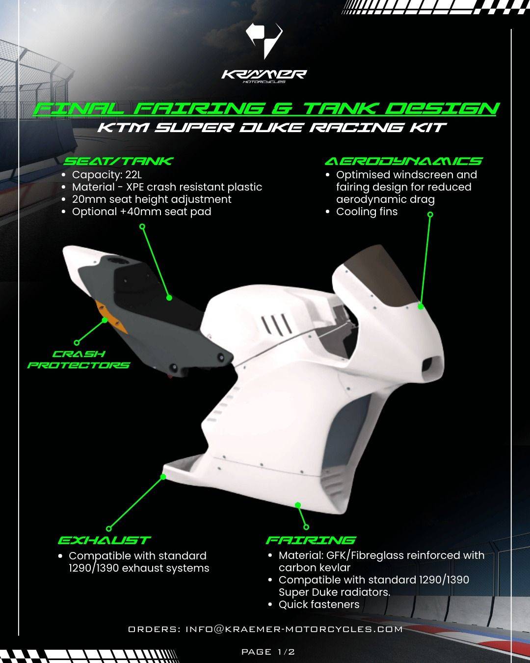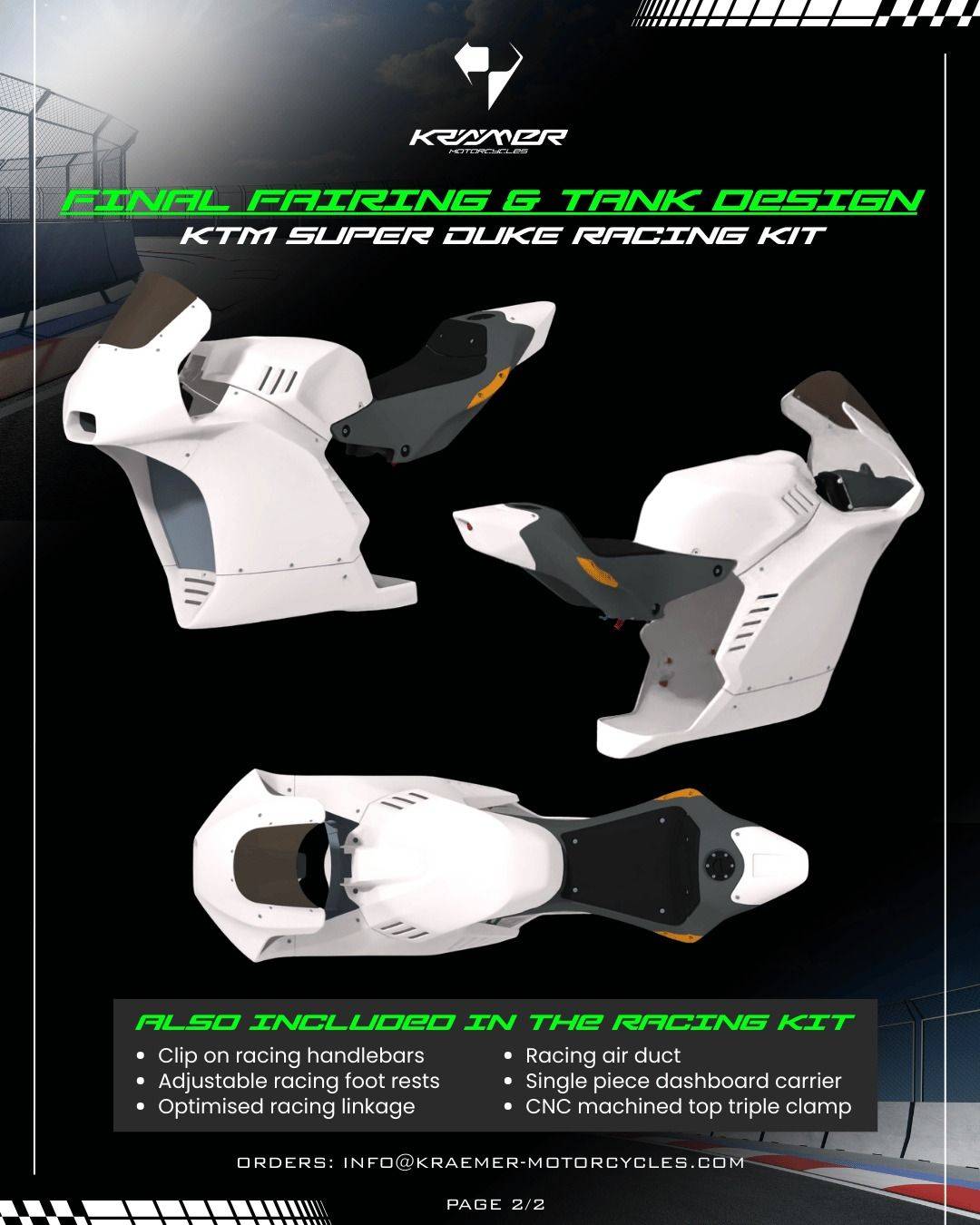 這套 Racing Kit 內(nèi)容非常完整,包含玻璃纖維/Kevlar 制成的空力整流罩、后置 22升油箱與可調(diào)高度座椅、CNC 上三角臺、一體式儀表支架、分離把、可調(diào)腳踏后移、可調(diào)式變速連桿、進(jìn)氣導(dǎo)管以及賽道專用排氣管。 唯一需要的,就是一臺 Super Duke 當(dāng)作基礎(chǔ)。