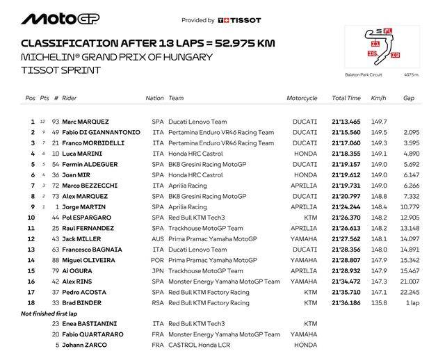 幸運(yùn)地避開(kāi)了第 1 圈的混亂,馬昆斯很快就取得了領(lǐng)先位置,隨后的比賽里、他很快就拉開(kāi)了與后車的距離,順利拿下了沖刺賽的勝利、連續(xù)第七次奪冠。落后前車 2 秒多,吉南托里奧拿到了第二,同樣來(lái)自意大利的隊(duì)友、21 號(hào)車的莫比戴利(Franco Morbidelli)獲得了第三。