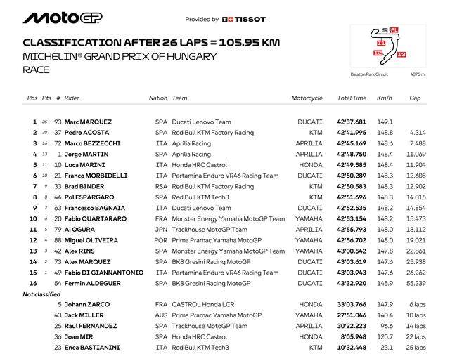 到第 11 圈,經(jīng)過(guò)了多次的反復(fù)較量、無(wú)數(shù)次的超越與反超越之后,馬昆斯取得了領(lǐng)先位置、并在隨后的幾圈比賽里快速拉開(kāi)了與貝澤奇的距離,到第 15 圈比賽結(jié)束時(shí),他的領(lǐng)先優(yōu)勢(shì)擴(kuò)大至超過(guò) 2 秒,沒(méi)什么能夠阻擋這位西班牙車手的了。最終,馬昆斯以超過(guò) 4 秒的優(yōu)勢(shì),奪得了匈牙利站正賽的冠軍,2025 賽季連續(xù)第七站比賽拿到全勝。