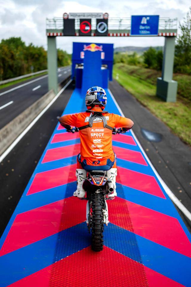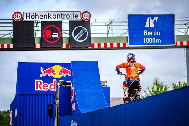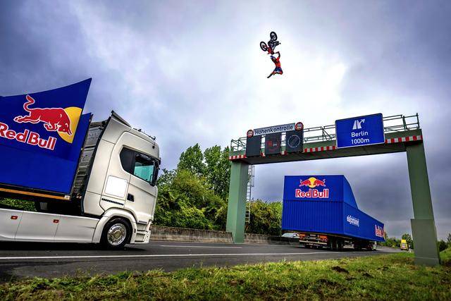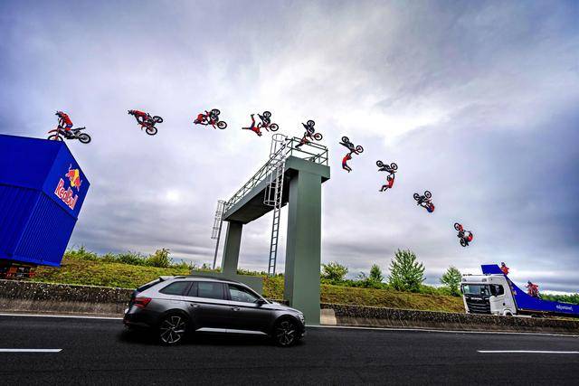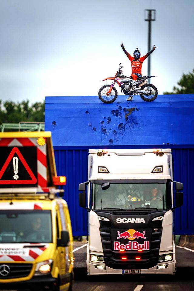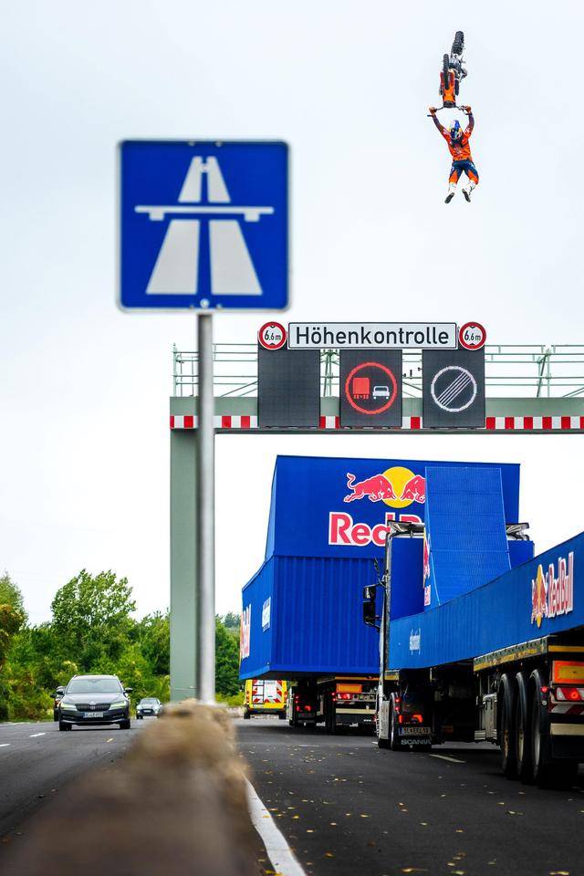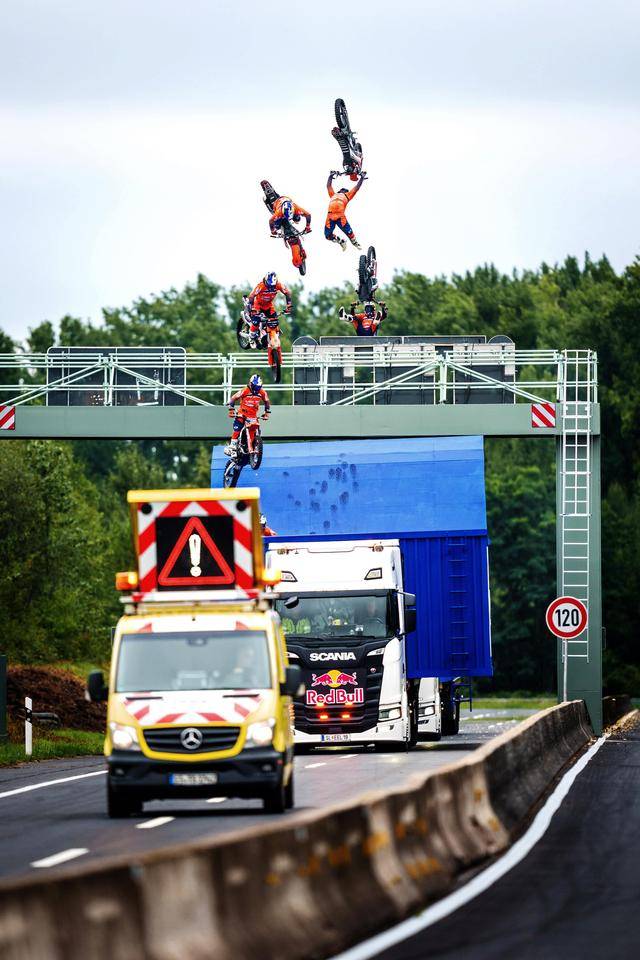 八月 21 日,F(xiàn)MX(Freestyle Motocross,自由花式越野)車手阿克曼(Luc Ackermann),在德國的一條高速公路上,在行駛中的卡車頂起步,以一個(gè)后空翻的動(dòng)作飛越公路的橫樑、落到另一輛移動(dòng)中的卡車上。
