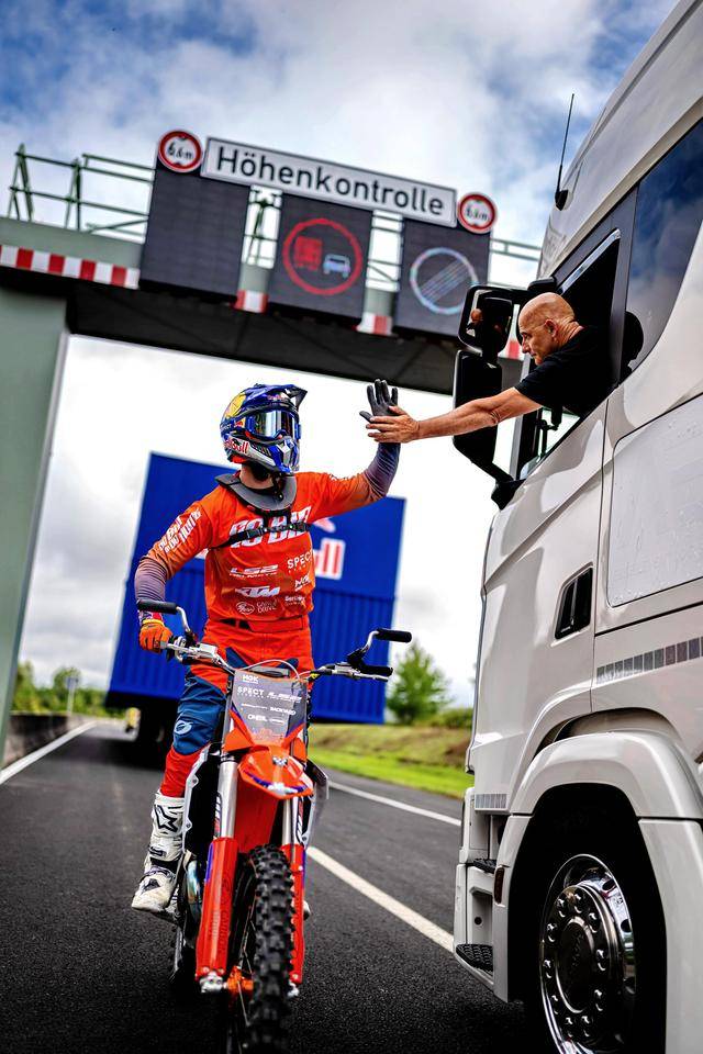 核心提示:八月 21 日,F(xiàn)MX(Freestyle Motocross,自由花式越野)車手阿克曼(Luc Ackermann),在德國的一條高速公路上,在行駛中的卡車