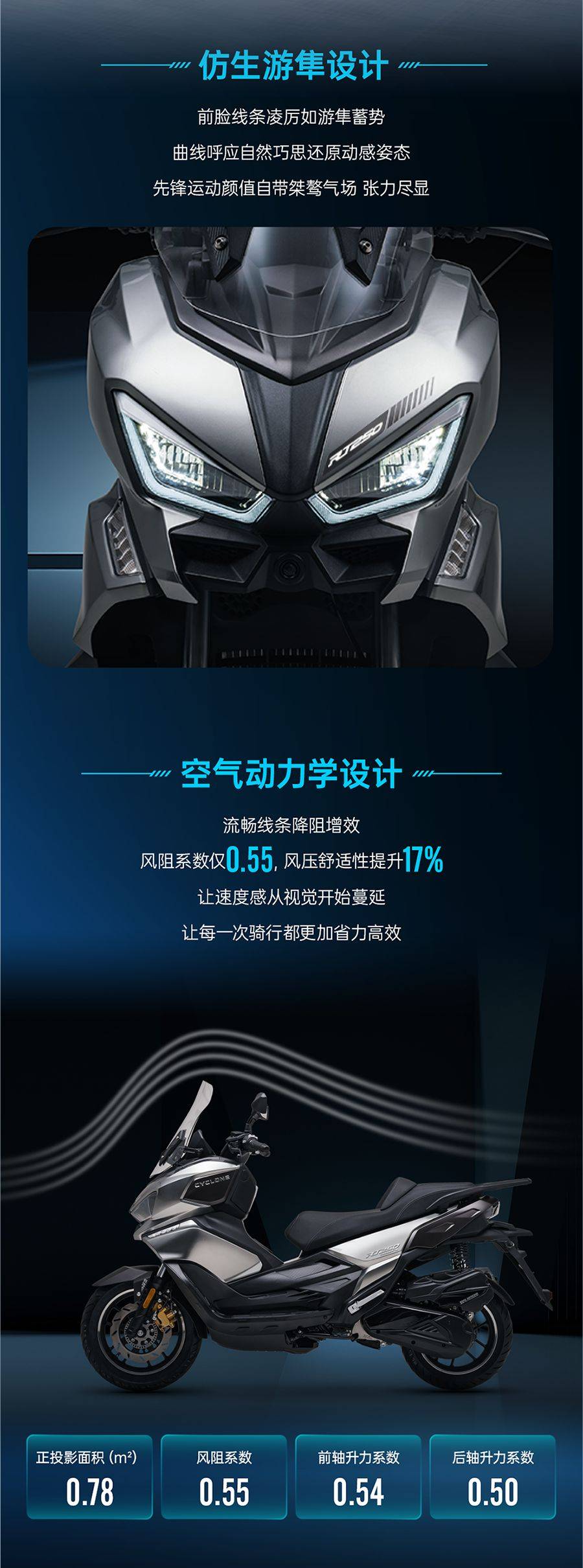 智能科技高配版的行車記錄儀,自帶汽車級(jí)哨兵模式,駐車發(fā)生振動(dòng)即觸發(fā)錄像,騎行時(shí)發(fā)生碰撞或急剎時(shí)也會(huì)自動(dòng)錄像。同時(shí)還配備了汽車級(jí)毫米波雷達(dá),可以實(shí)現(xiàn)起步預(yù)警、碰撞預(yù)警、盲區(qū)監(jiān)測(cè)、變道輔助四大功能。這些智能配置,在市場(chǎng)售1.6萬(wàn)級(jí)踏板中,是唯一配備的,超越了一眾競(jìng)品。配置齊全、豪華其他常見(jiàn)配置做到了齊全、豪華。以高配的智境版為例,標(biāo)配了雙通道ABS、TCS、投屏TFT表、胎壓監(jiān)測(cè)、隨車TBOX、無(wú)鑰匙啟動(dòng)、行車記錄儀、半熱熔胎、鋁合金輪轂、流水轉(zhuǎn)向燈、可調(diào)風(fēng)擋等應(yīng)有盡有。發(fā)動(dòng)機(jī)與RT3相同,上市多年且成熟的XQ310,動(dòng)力直逼300量級(jí)。運(yùn)動(dòng)化設(shè)計(jì)仿生游隼前臉設(shè)計(jì),犀利動(dòng)感,低風(fēng)阻系數(shù),整備質(zhì)量171公斤,搭配高剛性龍骨車架,輕盈好操控。兩個(gè)版本相差2000元,主要差異在TFT表、毫米波雷達(dá)、胎壓監(jiān)測(cè)、行車記錄儀、背光手把。顯然高配版更劃算,因?yàn)樵诮y(tǒng)計(jì)16000元級(jí)的250踏板中,沒(méi)有一款的配置有RT250高。近期,賽科龍連續(xù)上市了23988元的RT5,與RT250組成了250踏板雙子星布局,RT5注重舒適休旅、豪華滿配大踏板。RT250則是都市運(yùn)動(dòng)踏板,注重運(yùn)動(dòng)、靈巧操控,配置同樣豪華齊全,但16999元的性價(jià)比在目前業(yè)內(nèi)是明顯領(lǐng)先的。需要城市代步、休閑運(yùn)動(dòng)的高配高性價(jià)比中排踏板,RT250不容錯(cuò)過(guò)。