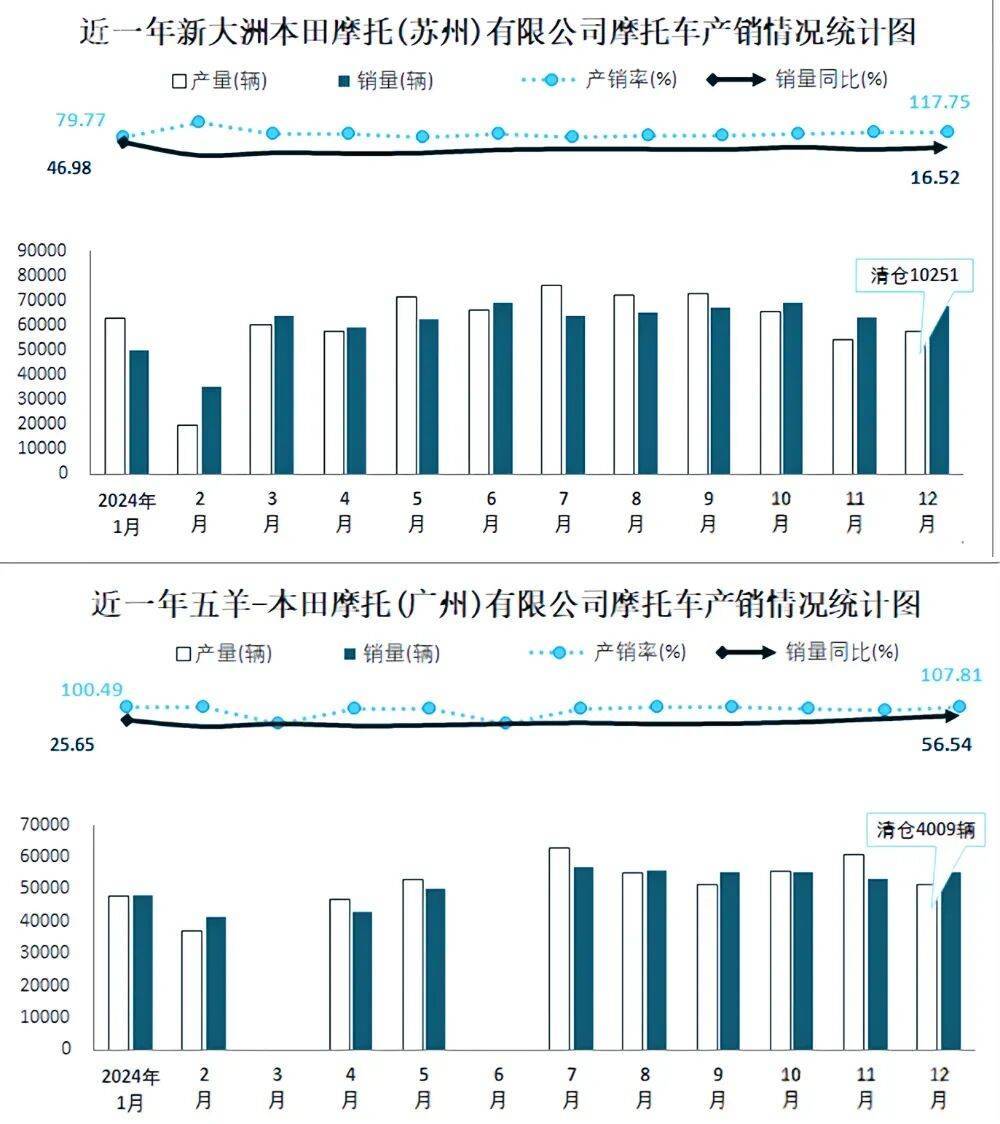 新大洲本田2024年的摩托車銷量達(dá)到了73.4萬(wàn)輛,五羊本田同期的銷量也有60.8萬(wàn)輛。