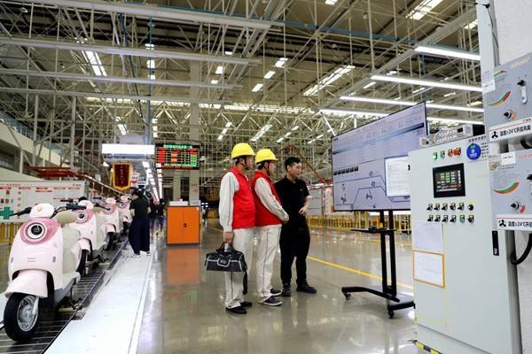 國網(wǎng)永川供電公司員工在雅迪集團(tuán)重慶永川電動車生產(chǎn)基地了解客戶用電情況。林熙熙攝