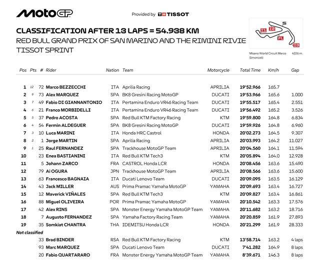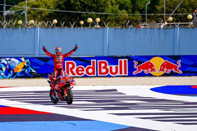 賽程為 13 圈的 Sprint沖刺賽,從排頭位出發(fā)的貝澤奇,發(fā)車之后就跑在了前面,上半段的比賽里,他與馬昆斯兄弟在前面的追逐、成為了全場的焦點;到第 6 圈,93 號車的馬昆斯(Marc Marquez)摔車退賽,剩下弟弟、小馬昆斯仍能對貝澤奇在 2025 賽季的首個沖刺賽冠軍構成威脅。