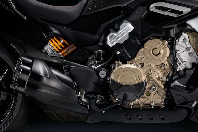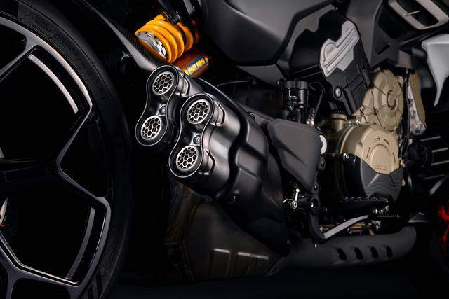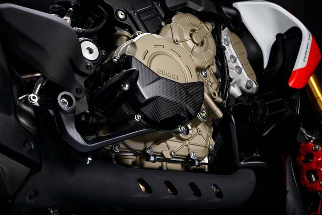新的 2026 Diavel V4 RS 搭載一副與超級跑車 Panigale V4 同平臺、但經(jīng)過重新調(diào)校的 V 型 90 度四氣缸、排氣量 1103 cc 的 Desmosedici Stradale 發(fā)動機(標準款的 Diavel V4 搭載 Granturismo 發(fā)動機),峰值動力輸出提高至 133.8 kw(約 182 匹。標準款的 Diavel V4 歐洲版為 124 kw/約 168 匹、國內(nèi)版為 123.6 kw),且復合歐五 + 排放標準(標準款復合歐五排放標準)。