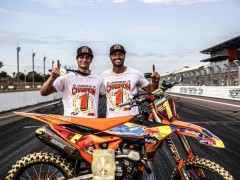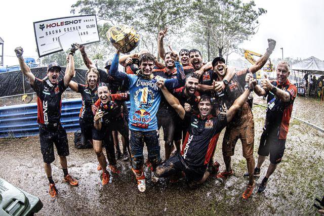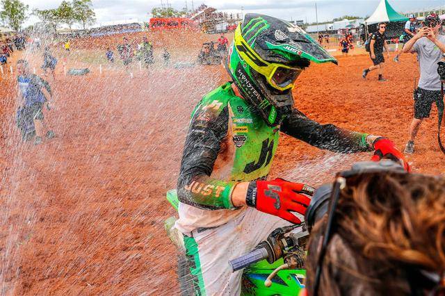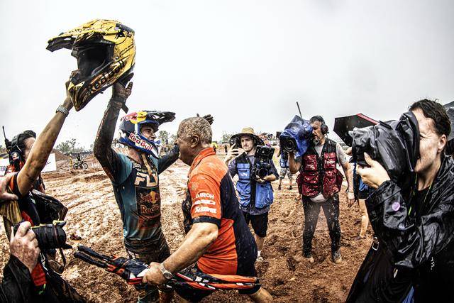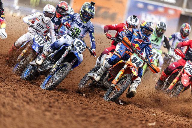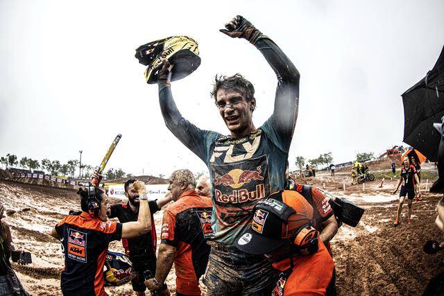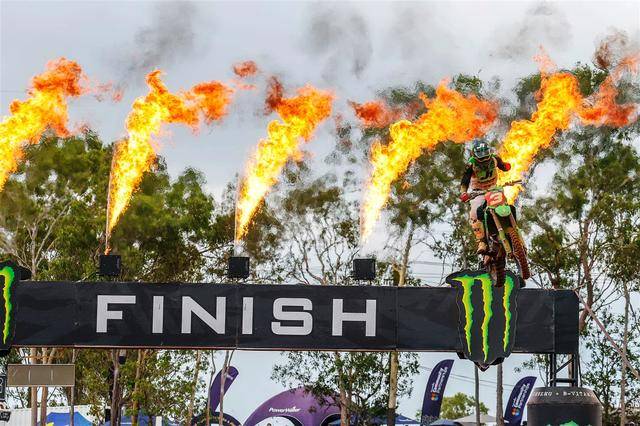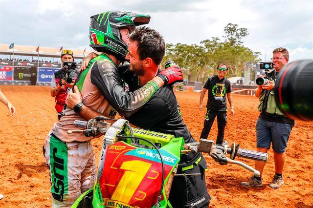 排位賽,科寧奪得了第一、率先拿到了 10 分,第二名的費(fèi)布爾拿到了 9 分;第一節(jié)比賽,費(fèi)布爾順利奪冠,同時(shí)拿下了今年 MXGP 級(jí)別的世界冠軍;科寧拿到了第二,獲得了年度亞軍。無關(guān)大局的第二節(jié)比賽,因?yàn)閻毫拥奶鞖舛∠?/p>