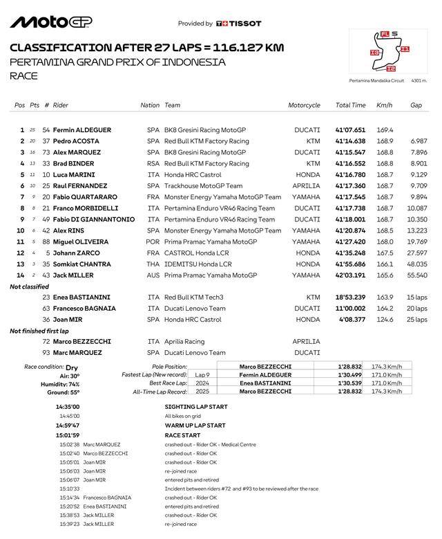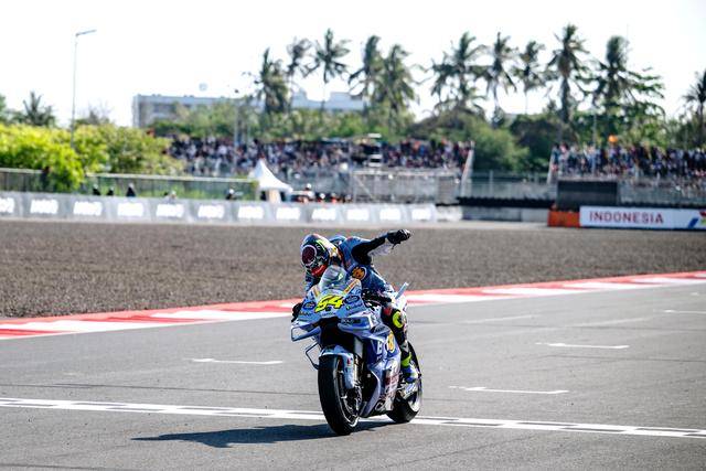 最終,阿爾德格以接近 7 秒的優(yōu)勢(shì)奪得了印尼站正賽的冠軍,這是他今年升上最高級(jí)別以來(lái)的首個(gè)分站冠軍。另一位西班牙車手、駕駛 37 號(hào)車的阿科斯塔(Pedro Acosta)獲得了亞軍;阿爾德格的隊(duì)友、同樣來(lái)自吉斯尼 MotoGP(Gresini MotoGP)車隊(duì)的西班牙車手小馬昆斯(Alex Marquez)拿到了季軍,這個(gè)季軍鞏固了他在積分榜第二的位置,同時(shí)也助力他提前四站、奪得了 2025 賽季獨(dú)立車隊(duì)/衛(wèi)星車隊(duì)的最佳車手。