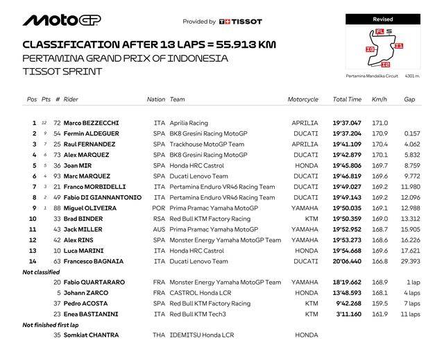 周末進(jìn)行的 MotoGP 級(jí)別 Sprint沖刺賽,阿爾德格在 13 圈的角逐里、在大部分的時(shí)間里都處于領(lǐng)先位置,惟在最后時(shí)刻、以 0.157 秒之差負(fù)于貝澤奇,僅拿到第二名、丟掉了職業(yè)生涯的首個(gè)沖刺賽冠軍;從第三位發(fā)車的費(fèi)南德茲、最后奪得了第三。