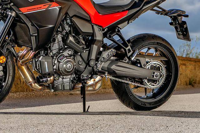 規(guī)格上,2026 Tracer 7 Y-AMT 系列搭載一副與運(yùn)動(dòng)街車 MT-07 屬于同平臺(tái)的水冷四沖程直列兩汽缸、DOHC每汽缸四汽閥的 CP2(十字曲軸)發(fā)動(dòng)機(jī),缸徑、行程仍為 80 mm × 68.6 mm,排氣量 689 cc,最大動(dòng)力輸出維持在 54 kw(約 73.4 匹),峰值扭矩輸出為 68 N.m/6500 rpm。與五月份是發(fā)布的兩個(gè) Tracer 7 版本相比,新版本明顯的變化是標(biāo)配了 Y-AMT 變速齒輪箱,兩個(gè)車型均不再有左手的離合器操縱桿(離合器牛角)、左腳的換檔桿,騎士無論是選擇 MT 手動(dòng)換檔和 AT 自動(dòng)檔模式,其切換都通過手指操作按鍵完成。