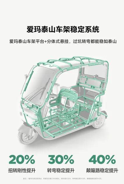 在安全性方面,愛瑪樂臻CA900采用了分體式獨立懸掛,在遇到崎嶇和斜坡時,每個車輪都能以獨立的角度進行自適應(yīng),達到與越野車同等的穩(wěn)定性與通過性, 轉(zhuǎn)彎穩(wěn)定性提升30%,顛簸路段平穩(wěn)性提升40%,在避免側(cè)翻的同時還能更好地吸收震動,減少顛簸感,提升乘坐舒適性。同時,900mm后輪距帶來的38°側(cè)傾臨界角將彎道行駛時的車身傾斜度降低41%,260mm踏板高度結(jié)合1600mm車高低重心設(shè)計,進一步提高了高速行駛穩(wěn)定性。再配合高亮三透鏡大燈+一體式貫穿尾燈,制動更靈敏的三剎聯(lián)動制動系統(tǒng),視野更開闊的700mmX600mm大尺寸前擋風(fēng),以及采用多角度調(diào)節(jié)設(shè)計的汽車級高清防眩可調(diào)節(jié)后視鏡,營造出全方位駕乘安全體系。