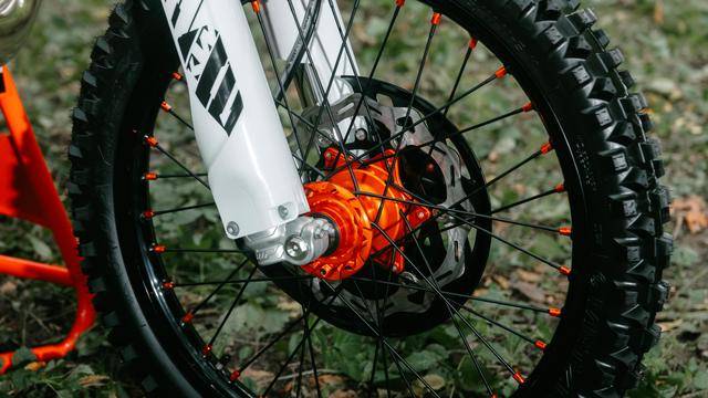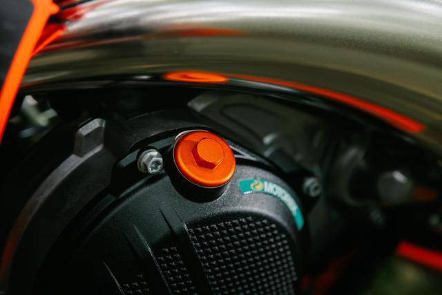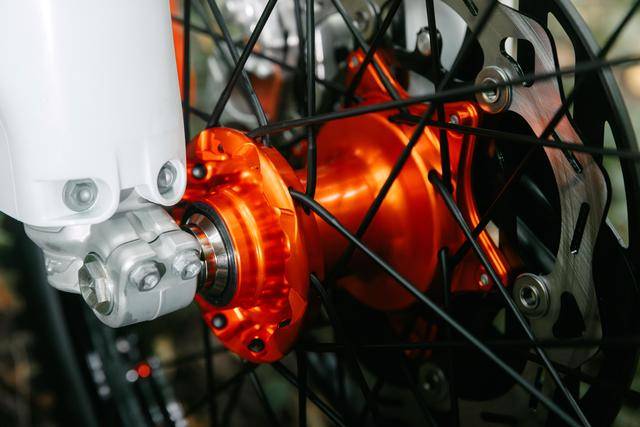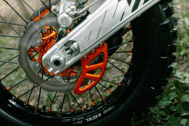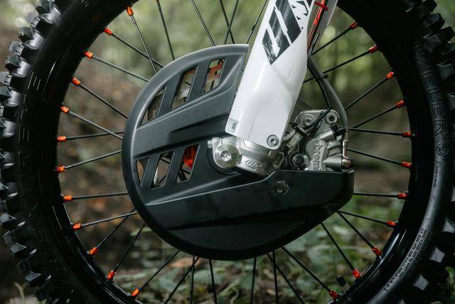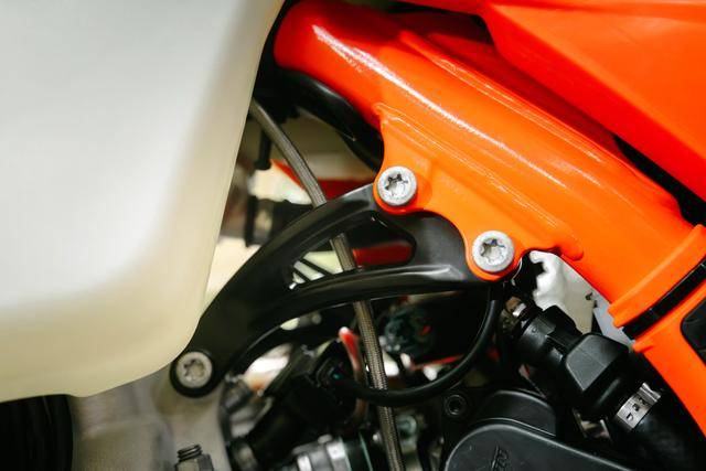 車體采用一副鋼制的車架,WP 配套的前后懸掛系統(tǒng),Brembo布雷博的剎車卡鉗和離合器液壓油泵,標(biāo)配了 LED 前大燈和剎車燈、側(cè)腳架,前 21、后 18 英寸直徑的車輪。與標(biāo)準(zhǔn)規(guī)格的 2026 款 300 EXC 相比,Hardenduro 版采用了帶防磨保護(hù)貼的、標(biāo)志性的橙色車架(標(biāo)準(zhǔn)版采用黑色的車架),鍛造材料經(jīng) CNC 加工而成的上下三星(前叉三角臺),換裝了浮動式的前剎車碟(標(biāo)準(zhǔn)版采用固定式的剎車碟),增加了前后剎車碟護(hù)罩,車把兩端的封閉式護(hù)罩,防滑賽車鞍座,車體前后拉索等。