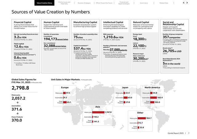 下面的圖片, 《Honda Report 2025》 “ Honda 2025 綜合報告書 ” 內(nèi)的部分?jǐn)?shù)據(jù)頁(圖片來源:Honda Global)。
