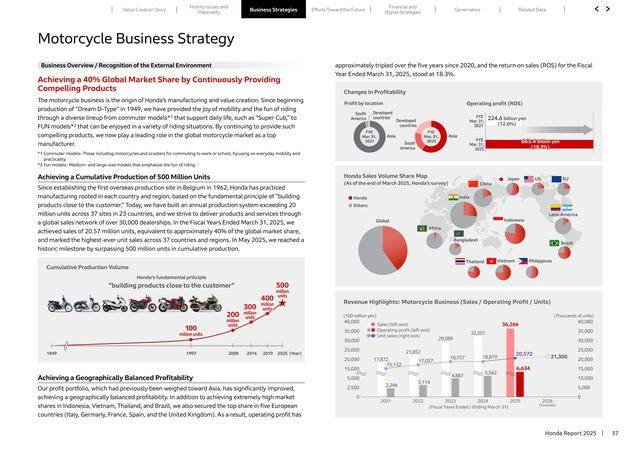3、在截至 2025 年三月 31 日的 2024 財年中,Honda 實現(xiàn)了 2057.2 萬輛的全球總銷量,該數(shù)字相當(dāng)于全球市場份額的大約 40%,并且創(chuàng)下了在 37 個國家和地區(qū)、單位銷量的歷史新高。在 2025 年五月,Honda 實現(xiàn)了歷史性的里程碑,摩托車的累計產(chǎn)量突破了 5 億臺;