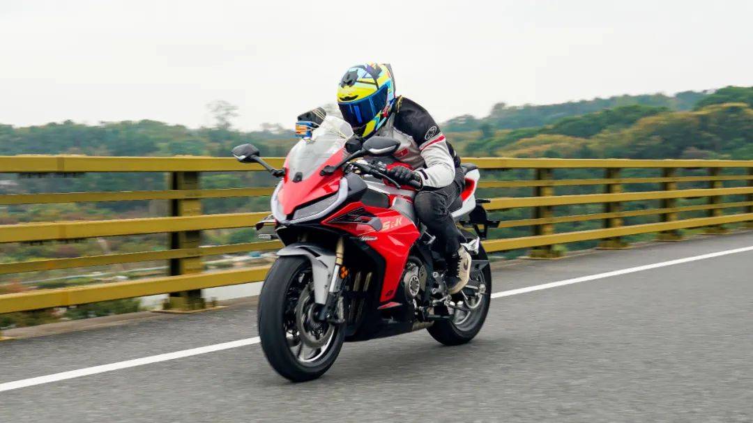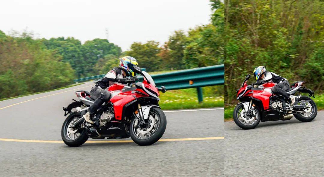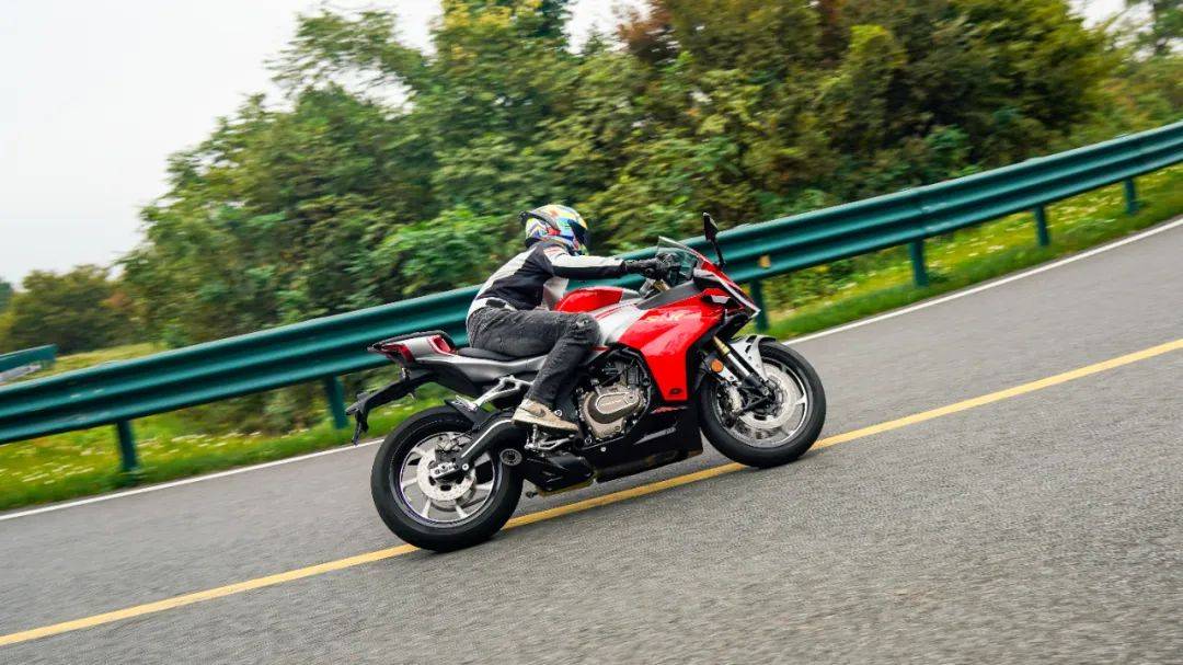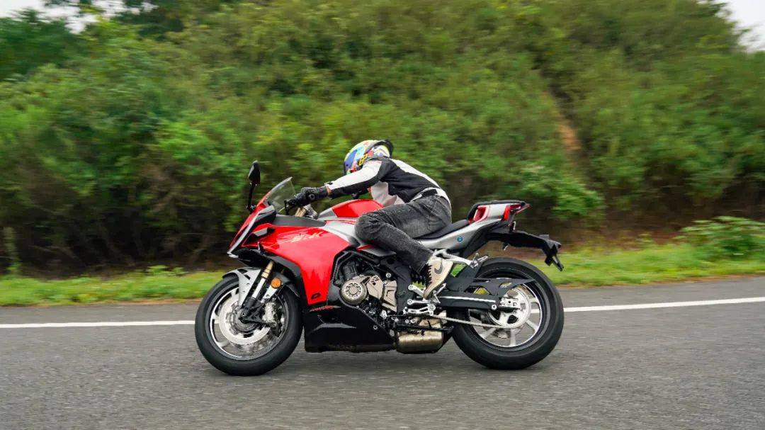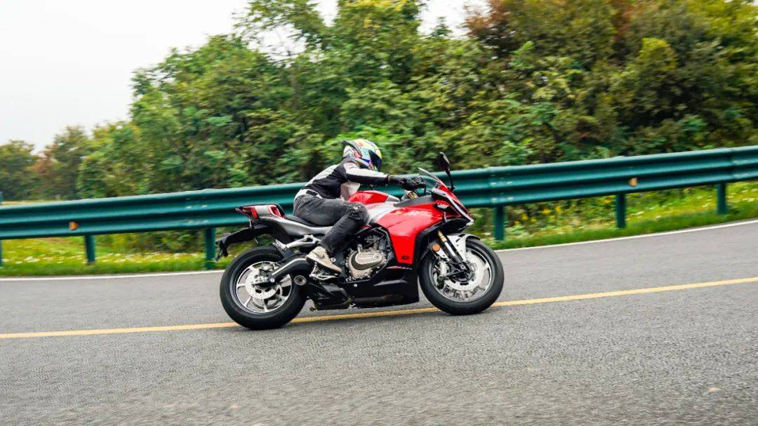 騎行三角同樣考慮到日常使用,手把高度也并非純跑車設定,較高的上聯(lián)板位置,配合較低的坐墊高度,在騎行時腰部帶有一定的前傾,但仍在可接受范圍內,整體偏低趴但不極端,這樣的設定能更好兼顧日常騎行,對新手的上手難度低。加速性能及震動并不是說考慮到日常使用,就放棄了車輛的高轉速性能,賽421在這兩者之間做到了較好的兼顧,極限斷油轉速在14500轉,14000轉時爆發(fā)最大馬力77.5匹,其中高轉動力表現(xiàn)出色;同時通過調整ECU噴油以及動力曲線,讓低轉速域也能擁有不錯的扭矩釋放,在小油門操作時,將轉速維持在3000轉,不斷升檔,直到6檔3000轉,這臺引擎依然穩(wěn)定,不拖檔也不喘,對于一臺高轉速引擎來看,這個表現(xiàn)難能可貴,值得好評。經(jīng)過測試,零百加速做到了4.1s(體重154斤),實測1檔的極速在92km/h,2檔132km/h,3檔167km/h,往后的檔位受制于路況安全并未一一測得。按照前面檔位的加速力道,合理推測極速突破220km/h是毫無壓力的,這個動力水準應對各個使用場景是輕而易舉。為了模擬日常使用中的加速超車場景,在快速路上體驗再加速能力,油門全開,車輛可以輕松完成從100到140的加速響應,再次測試,從120到170(表顯),加速同樣給人感受迅猛,這期間動力線性順暢,基本能滿足絕大部分摩友的動力需求。摩托財智,贊9加速過程中,油門的響應線性可控,引擎的運轉質感帶來出色的駕駛反饋和愉悅感,在同級中可排一流水準,尤其是四缸引擎高延展性的出力特性和綿密聲浪,給人的駕駛愉悅感拉滿。高速狀態(tài)下,維持150的速度騎行約1公里左右,車身非常穩(wěn)定,前輪穩(wěn)定的貼合路面,經(jīng)過大橋遇到較明顯的橫風,也沒有出現(xiàn)晃動,值得好評。震動抑制水準就我們的駕駛場景來看,可以給到優(yōu)異的評價,僅在12000rpm時存在一定的震感,主要集中在腳踏部位,較為綿密但完全可接受,對應速度已在140以上,常使用中基本用不到如此高的轉速,手把與坐墊位置則一直沒什么震感,表現(xiàn)相當出色,讓整車的運行質感增色不少。當然也有表現(xiàn)不足的地方,在高速行駛狀態(tài)可以清晰的感受到風擋的保護效果甚微,高速需求多的車友建議更換大一點的風擋。同時沒有快排的加持,個人感覺缺點什么,以及原車檔位過輕,加速時1升2檔有時會打進空擋,需要注意下。