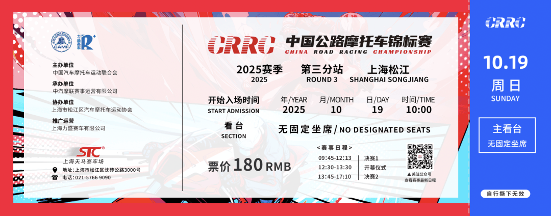 本場比賽我們歡迎熱情車迷們的到來,親歷摩托車運動的激情轟鳴,感受速度的魅力,CRRC不止是一場比賽,在日漸涼爽的黃金十月,我們希望能為廣大車迷打造一個有看有吃有玩的摩托車狂歡周末。