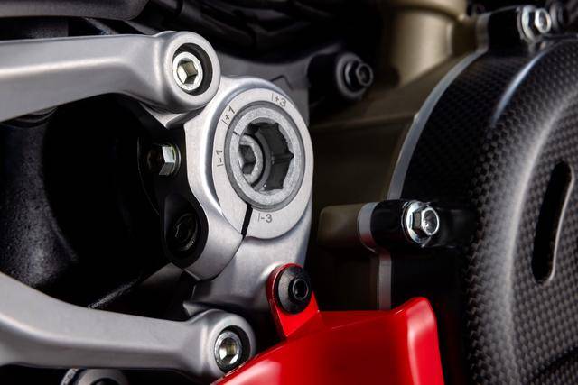 4、新 R 版的車架/底盤基于非賽道規(guī)格的 2025 Panigale V4/V4 S,車架降低了橫向剛度(降低了大約 40%),配合空心對(duì)稱式設(shè)計(jì)的、連接樞軸可對(duì)高度作四級(jí)(2 mm 范圍內(nèi))調(diào)整的雙后搖臂,能夠最大限度地提供當(dāng)前比賽專用光頭胎(Slick Tyres)的抓地力,將發(fā)動(dòng)機(jī)的最大性能作用于地面。新的車架和搖臂使車輛具有更好的循跡性能,也提高了出彎時(shí)的牽引力、和加速時(shí)給予車手的感覺;