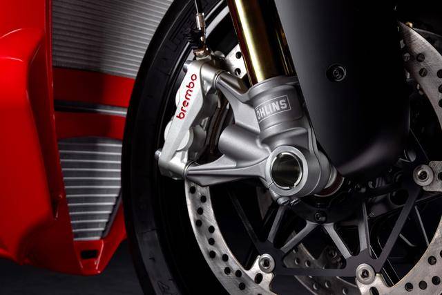7、懸掛系統(tǒng)方面,標(biāo)配了叉芯口徑為 43 mm、標(biāo)準(zhǔn)行程為 125 mm 的 Ohlins 奧林斯 NPX25/30 倒立式前叉,以及行程為 130 mm 的 TTX36 后減震;此外,R 版還采用了首次被標(biāo)配到量產(chǎn)車型上、奧林斯的新型 SD20 轉(zhuǎn)向阻尼器;