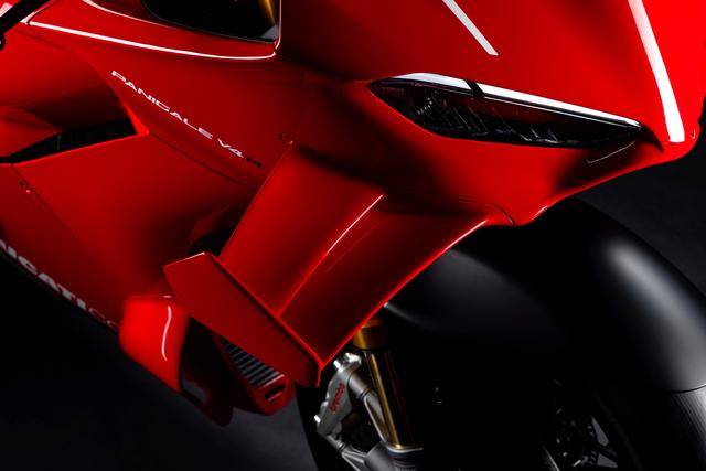 6、另一個(gè) R 版的新型空氣動(dòng)力學(xué)組件,是首次配備到量產(chǎn)車型上的 Corner Sidepods “ 彎道側(cè)箱 ”,而常規(guī)版本的 2025 Panigale V4/V4 S 則沒有此組件。該組件是杜卡迪在 2021 年 MotoGP 工廠賽車 DesmosediciGP 上的解決方案,該設(shè)計(jì)的功能,是當(dāng)車輛處于高速、且高傾斜角度時(shí),“ 彎道側(cè)箱 ” 能夠產(chǎn)生 “ 地面效應(yīng) ”,讓輪胎具有更高的抓地力,從而允許更高的速度過彎。騎行過程中,尤其是在高速行駛時(shí),車手可以清楚地感覺到車輛一到達(dá)彎道中心時(shí),車輛就已經(jīng)會(huì)自然地往轉(zhuǎn)向路線的內(nèi)側(cè)移動(dòng),這使得車手能夠保持著一條更精確的轉(zhuǎn)向路線,讓出彎的加速階段更加從容;