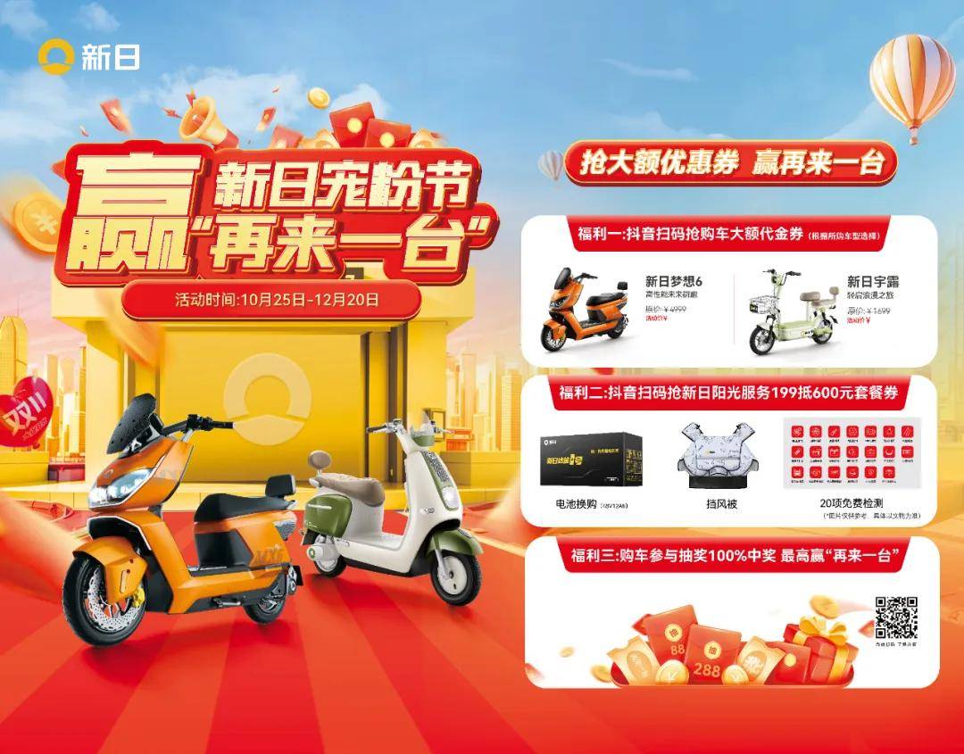 10月25日-12月20日的“寵粉節(jié)”期間,只要購買新日電動車就能參與火爆活動,享受超值優(yōu)惠: